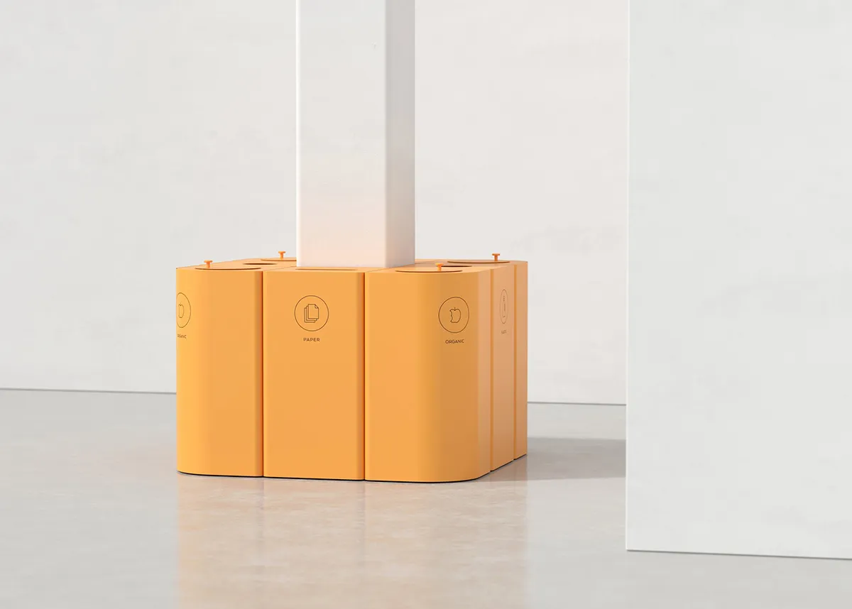 KLOSS has the ability to blend in or characterize a space depending on the choice of color and accessories. The systems modularity makes it possible to build almost any formation and to change the constellation over time to continuously follow actual needs. KLOSS can be unlimited repeated, flow along walls, follow inner- and outer corners and even embrace pillars. The modules can also be grouped in small or large freestanding recycling islands. If a recycling solution needs to be mobile, the KLOSS units can easily be mounted on wheels.