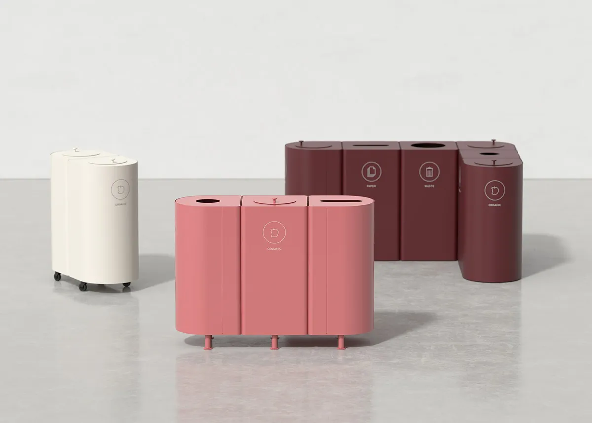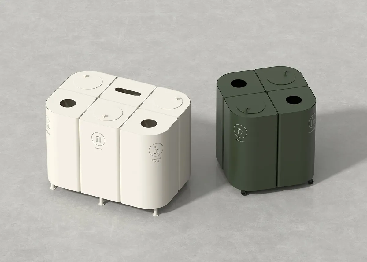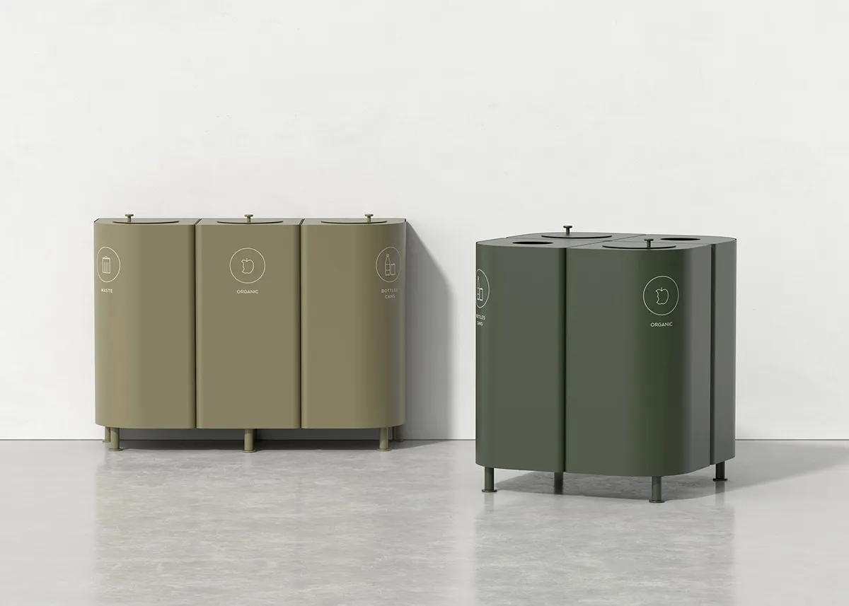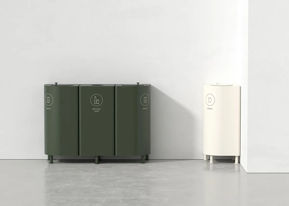 KLOSS design concept includes three steel modules with different shapes and visual properties to be used singly or in various groups and creative formations. All modules are prepared to be elevated on adjustable legs or on wheels, and to be equipped with a range of different open tops and a soft-closing lid. Every unit has an integrated bag holder and can be complemented with a separate inner container, to prevent leakage and to help reduce the use of bags. All connected modules can easily be disassembled, and regrouped into completely new formations – at any time!