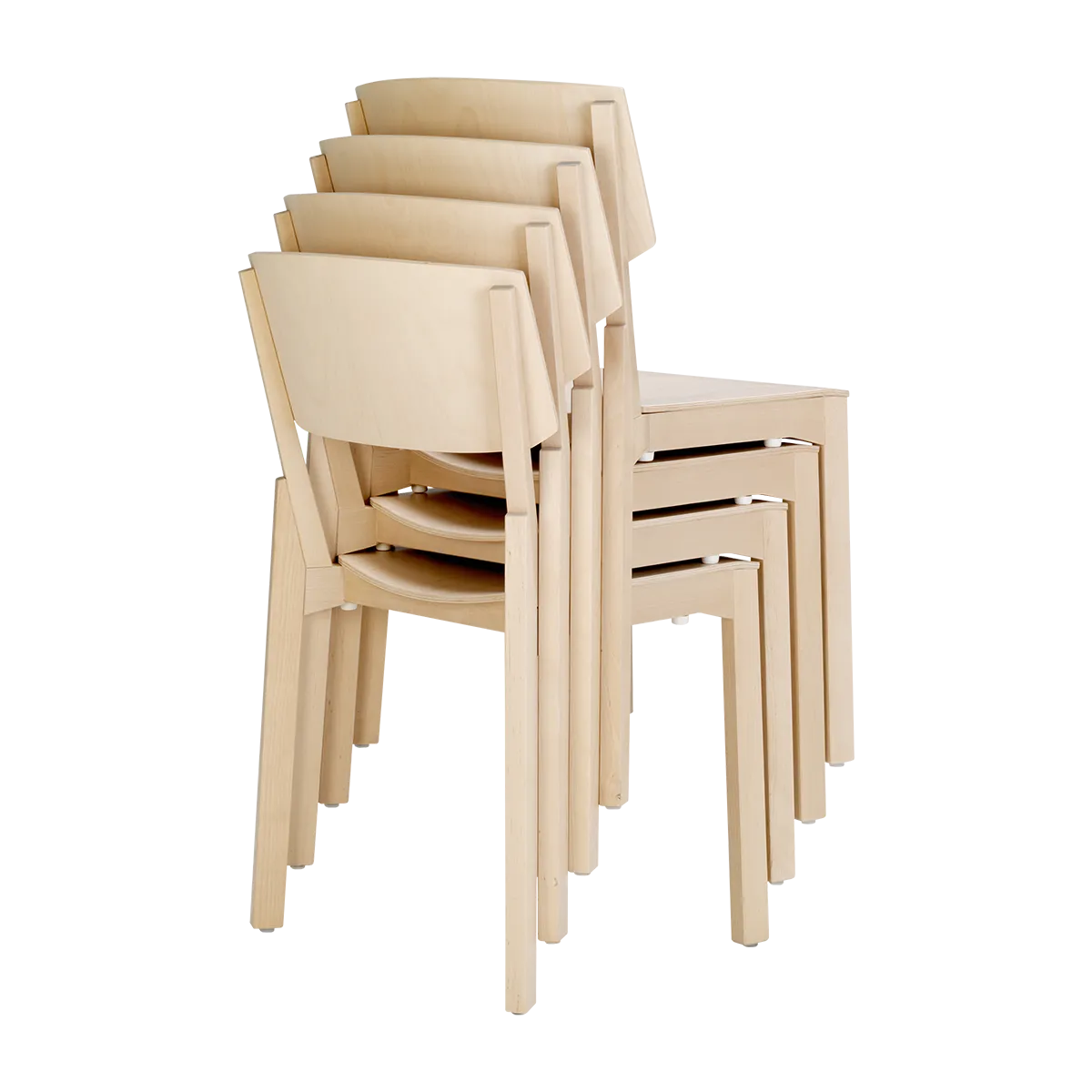 The stackable chair and armchair originates from a construction concept – one wooden hub joining together frames, legs and back posts.
