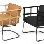 Steel frame in chrome or copper. Moulded frame in ash, down filled cushions.
