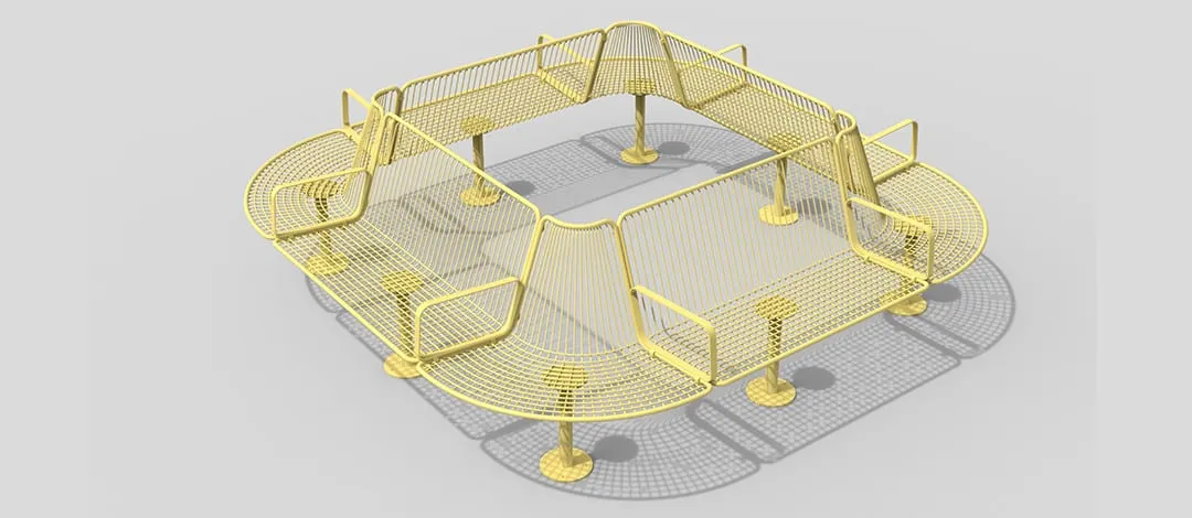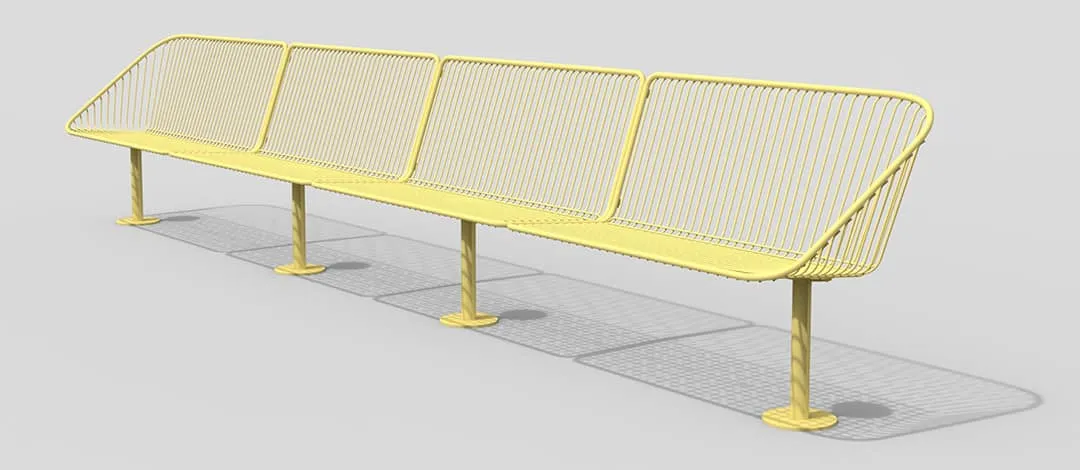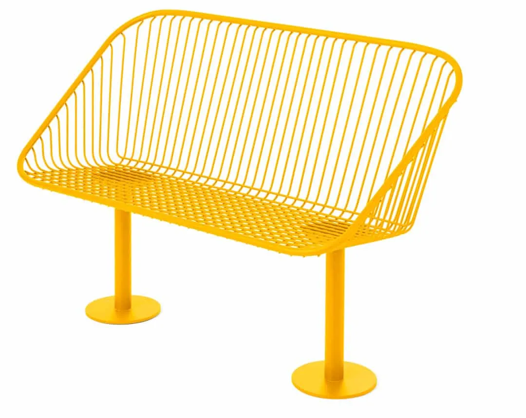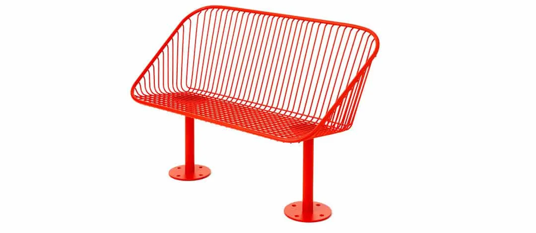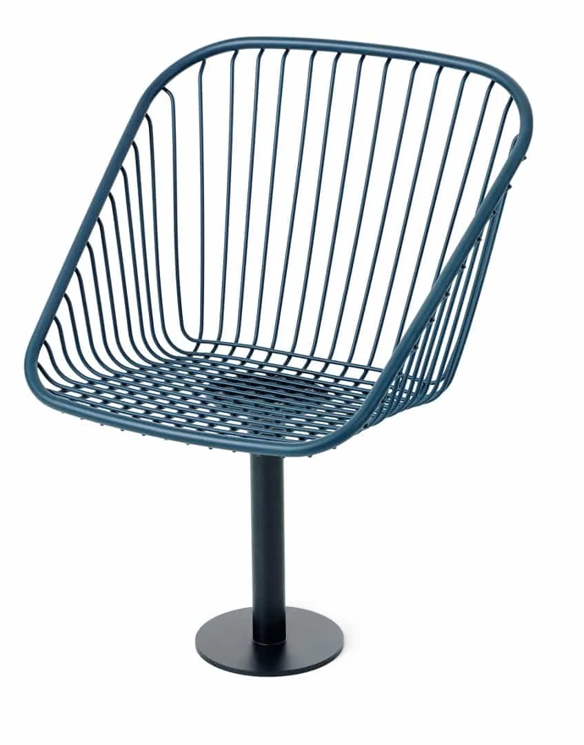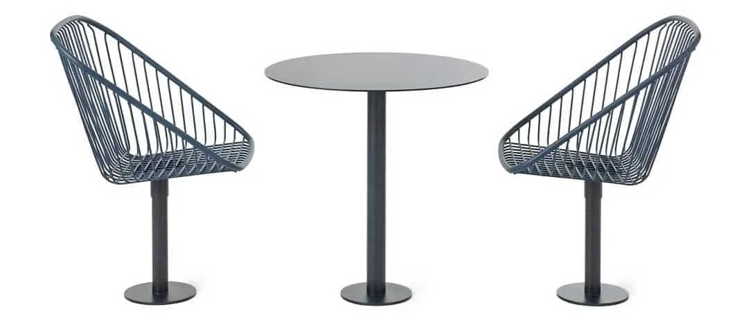 The Korg furniture group is made in a streamlined style and crafted in steel thread for use outdoors. Each seat is attached to cylindrical support anchored to a round base. The steel threads form vertical lines that give each design a strong graphic profile. The seats are comfortable to sit in and have the advantage of having a construction that enables water to run off. The armchair can swivel on its own axis to turn towards the table, or face another direction. The group consists of a backed bench, chair and side table colors in deep blue or fiery red.