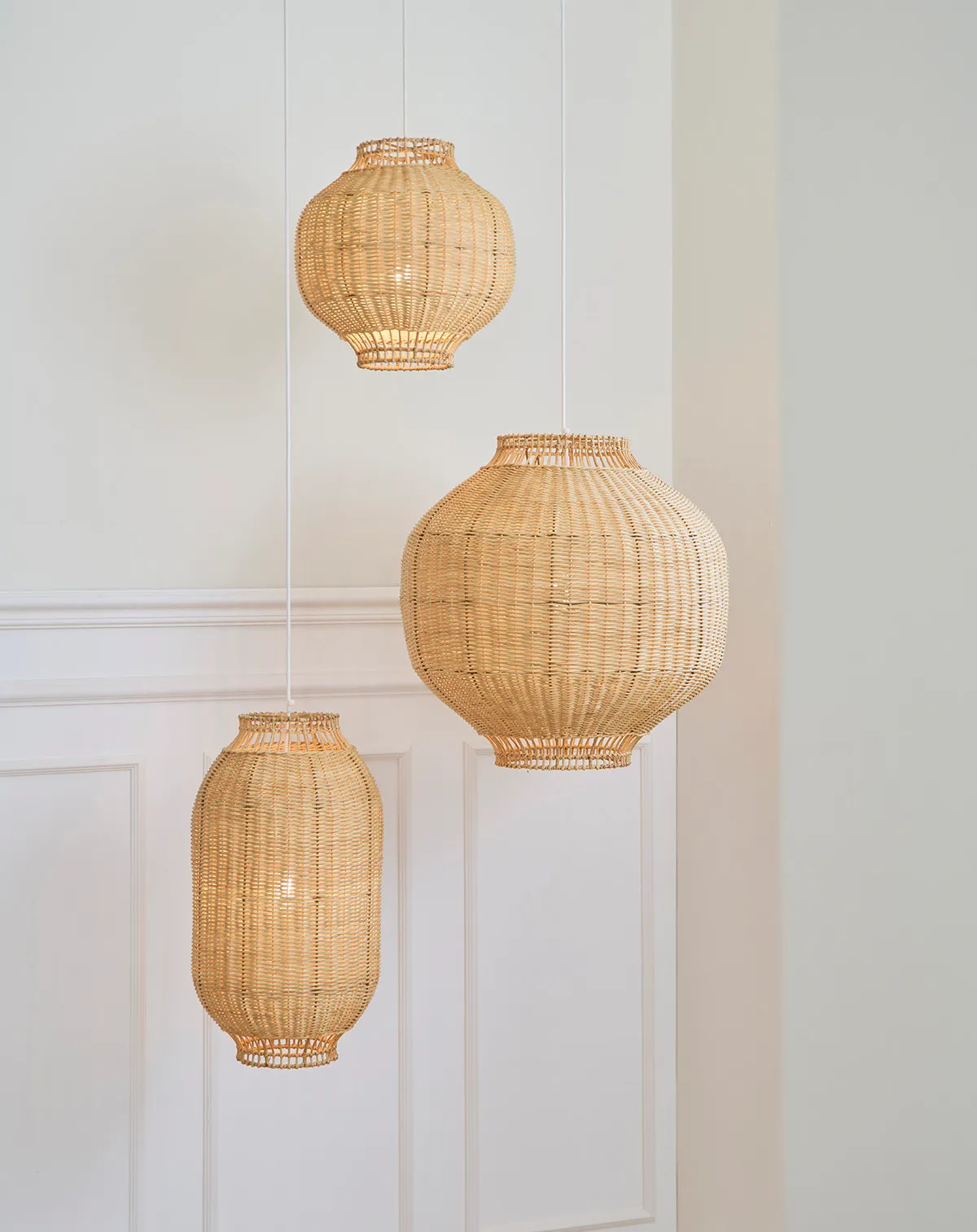 Each lamp in the collection features handwoven rattan construction that creates intricate shadow patterns and warm, diffused light.