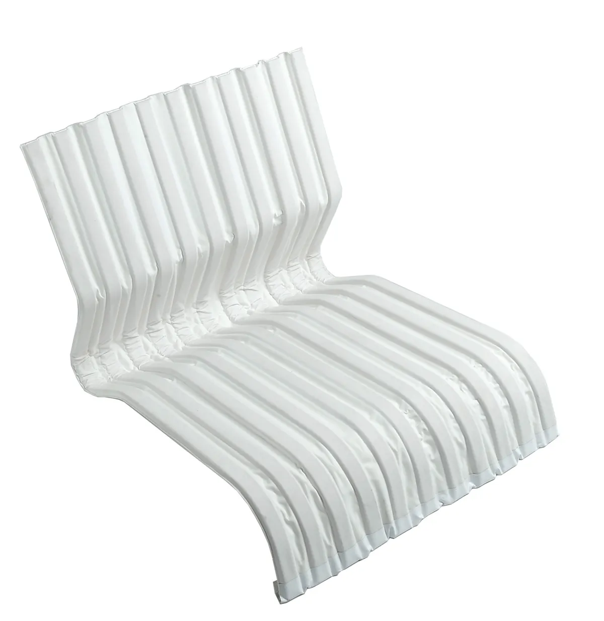 The design emphasizes the relationship between laths and fabric: two materials working together to provide support, flexibility, and lightness. The chair aims to achieve comfort with minimal material, creating a flexible structure that offers comfort without traditional upholstery.