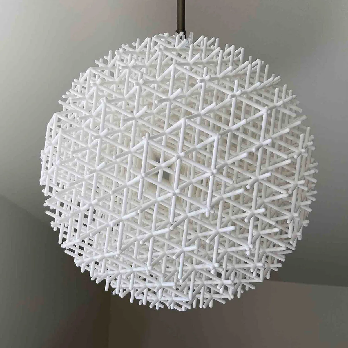 Made of the characteristic grid that builds volumes in additive manufacturing in order to save material with maintained strength. Here interpreted into a light globe where the structure diffuses the light and creates an intriguing moiré-effecct. With thanks to Konstnärsnämnden and Zero Belysning.