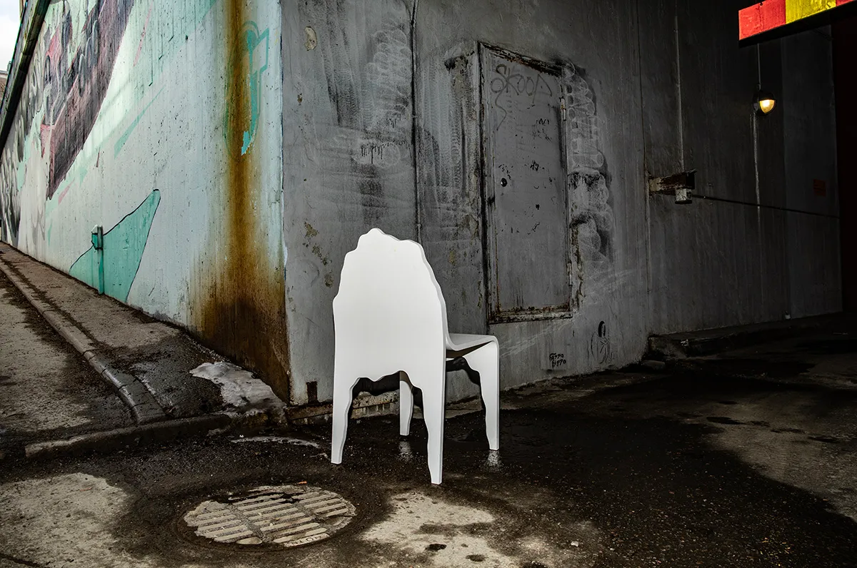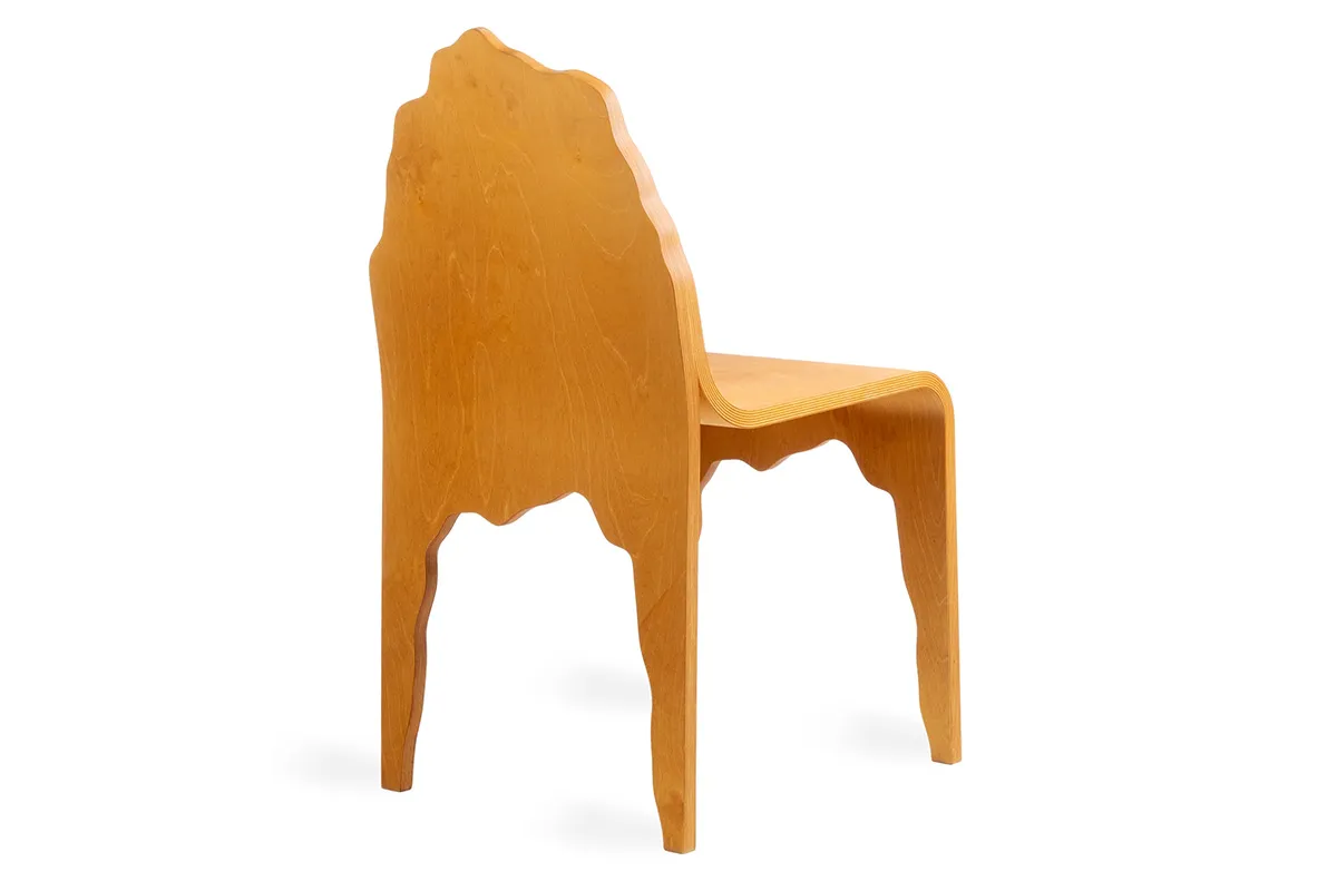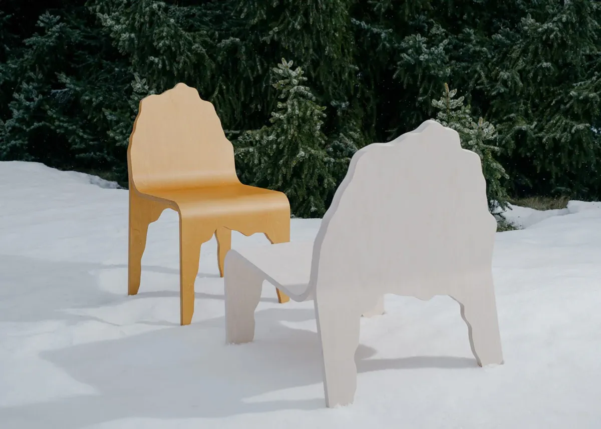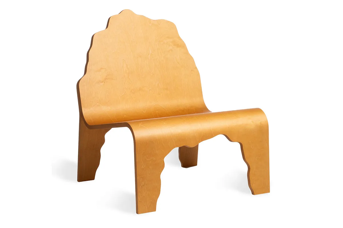 Designed in New York, NY by Snarkitecture and produced in Halikko, Finland by Made By Choice. The collection builds on the Finnish heritage of bent plywood furniture. The chairs adapt a simple design that involves a single piece of bent plywood that splits to form the seat and legs.