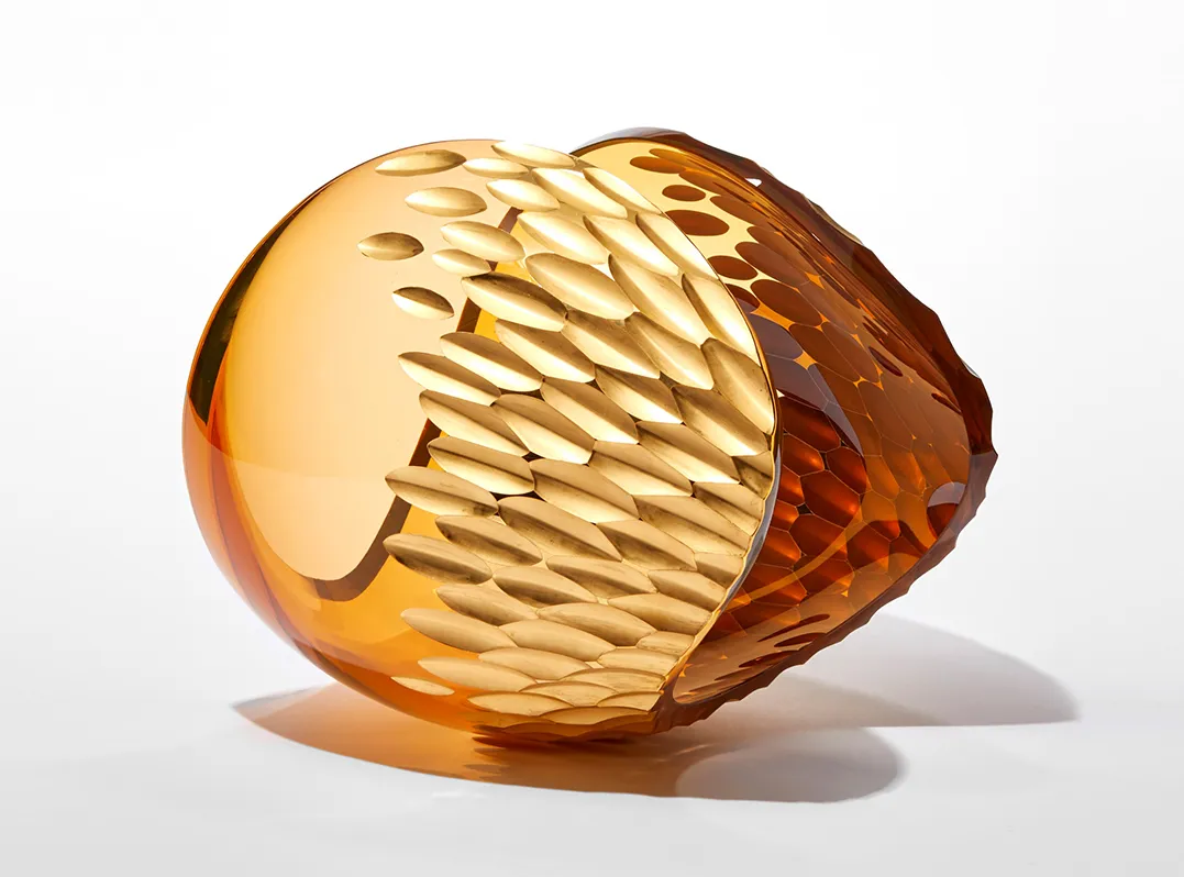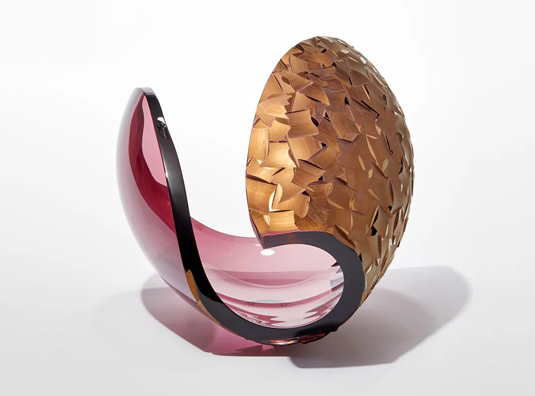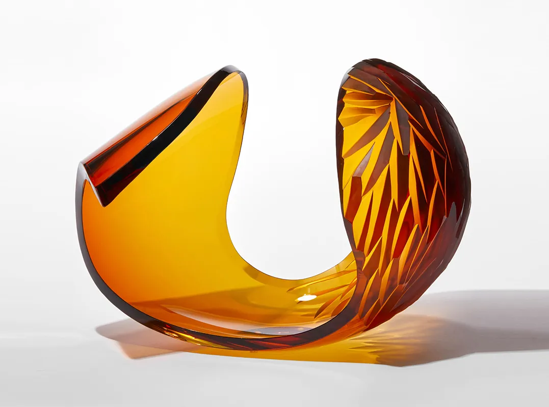 These are extremely technically challenging to make. An initial blown, ovoid shape is created in layered coloured glass, with the unwanted glass labourously cut away to create the shell-like form. The edge is then ground and polished to create a captivating line, that draws the eye.