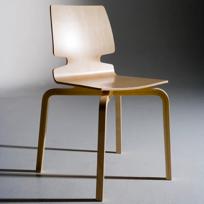 Lento designed by Harri Koskinen in 2006/2009, the lento chair is made of pressed birch plywood in natural lacquered, matt black lacquered, or matt white lacquered colors. lento chair is a stackable chair. Upholstered version also available. shipped assembled.