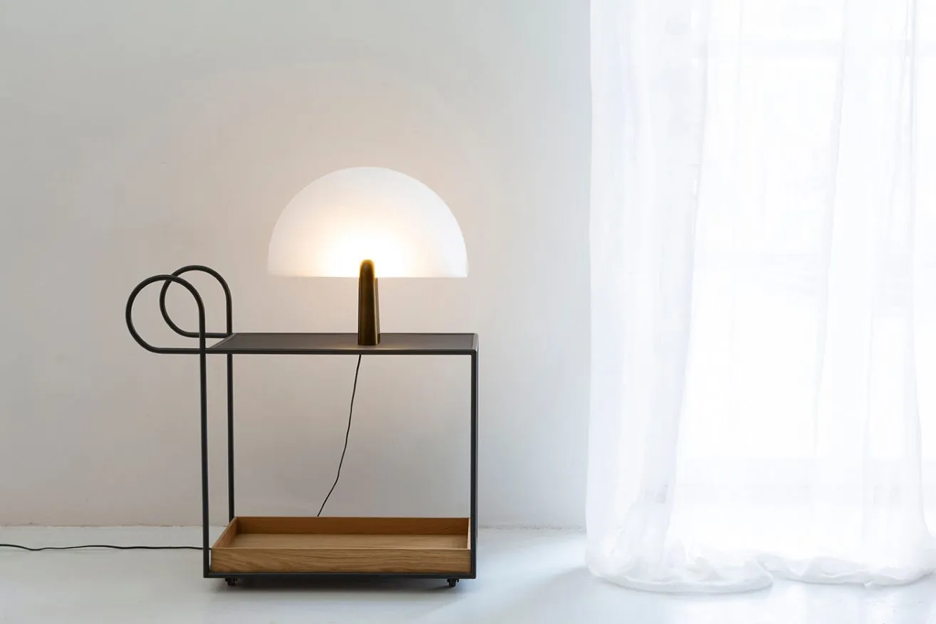 The lamp consists of a base of solid aluminium and a lamp shade of recycled polymer. The combination of the bright semi-circular shade and the solid base creates an exciting contrast in shape and colour and gives the room a beautiful silhouette. The light source that emits a warm glow has been carefully adjusted to create the best possible light distribution in the evening. During the day, the milky white lampshade captures the daylight and acts as a beautiful object in itself.