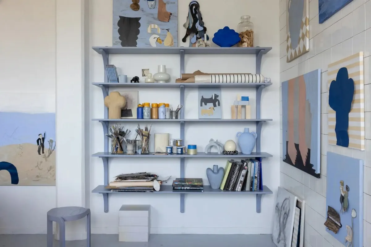“My shelves contain some books, a handmade ceramic clock, a secret storage box, and a papier-mâché sculpture my son made at art school. Small sculptures are something I think people should have more of—they really elevate a space.”