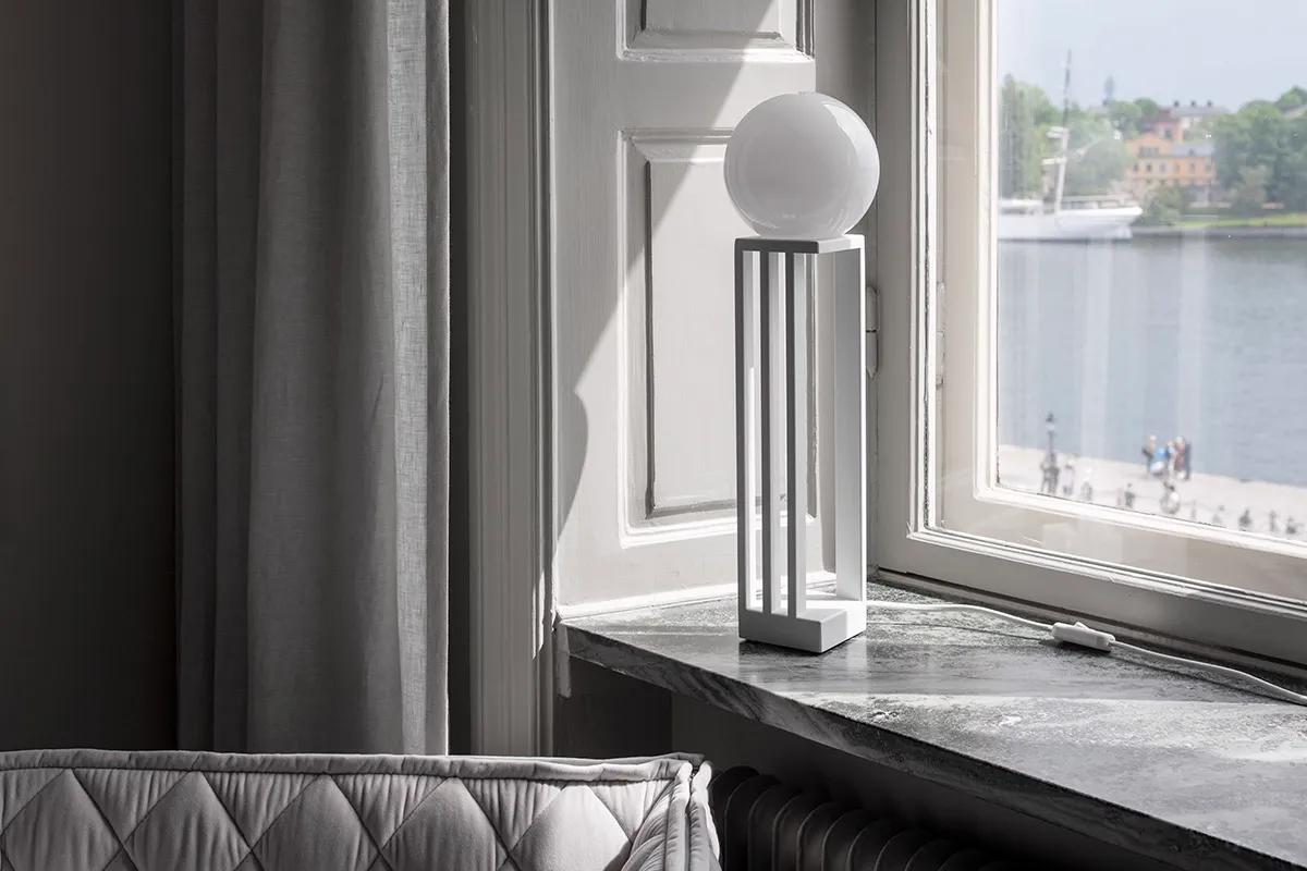 Libreria, designed by Folkform, has a powdercoated steel construction and the glass globe is made of opaque glass. Originally Libreria was designed for an exhibition held in Milano 2017 in an old bookbinders.