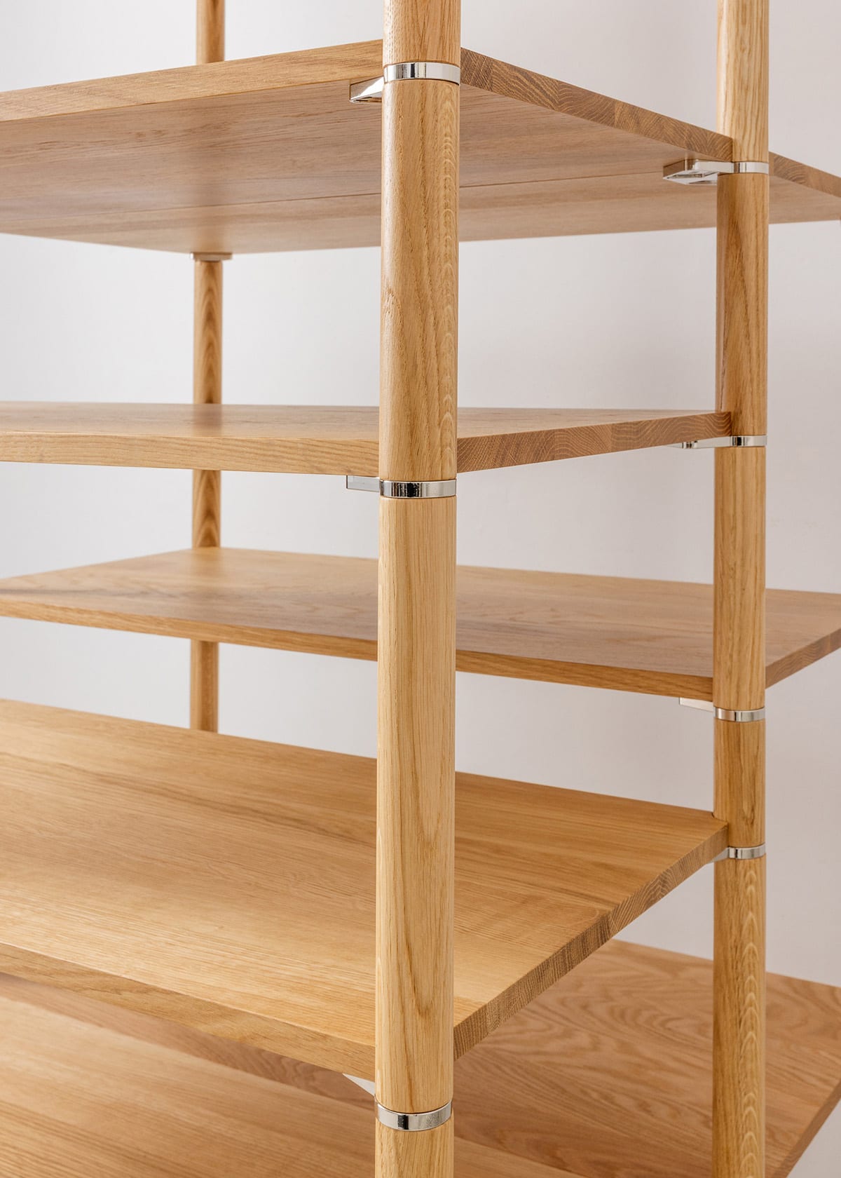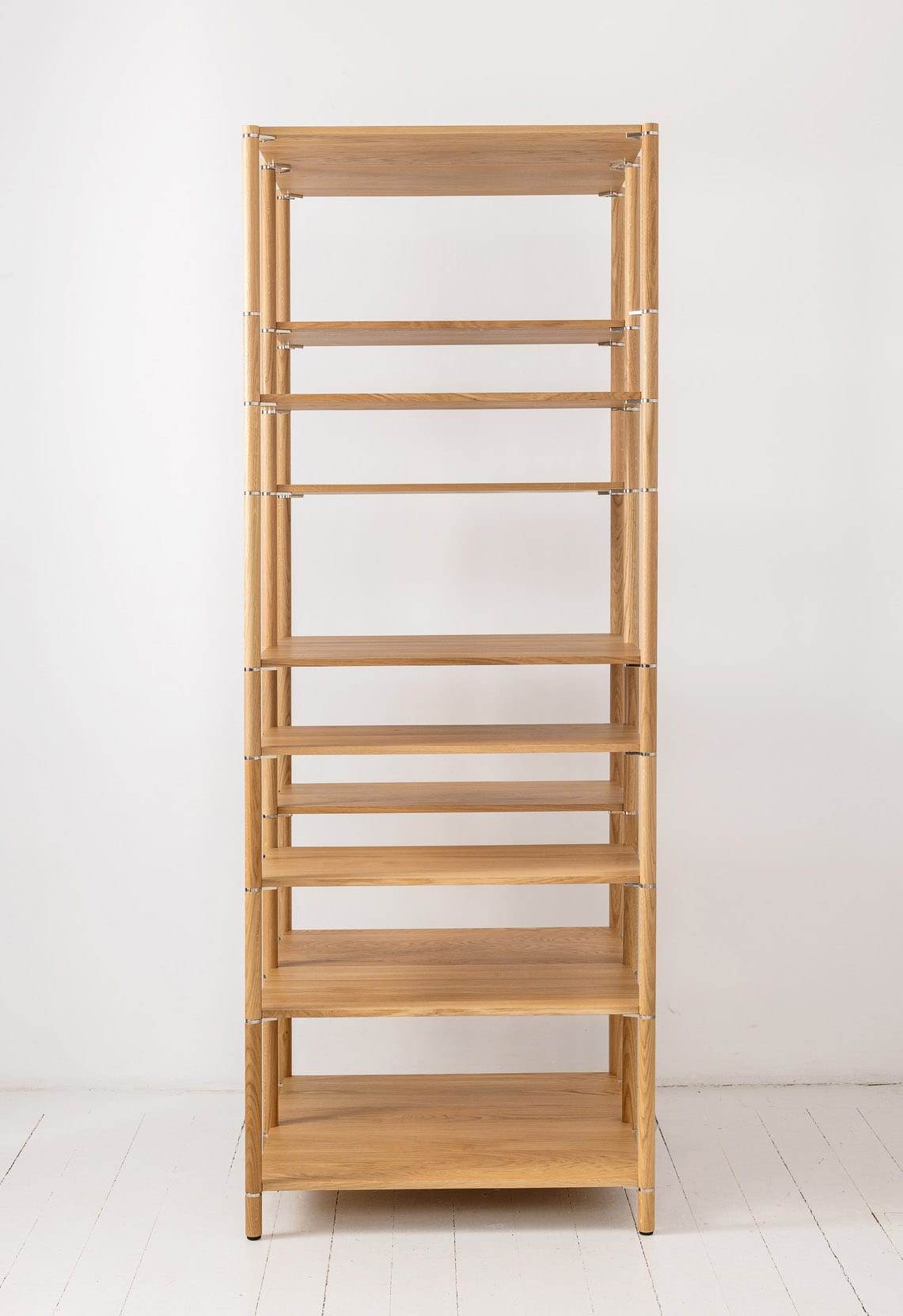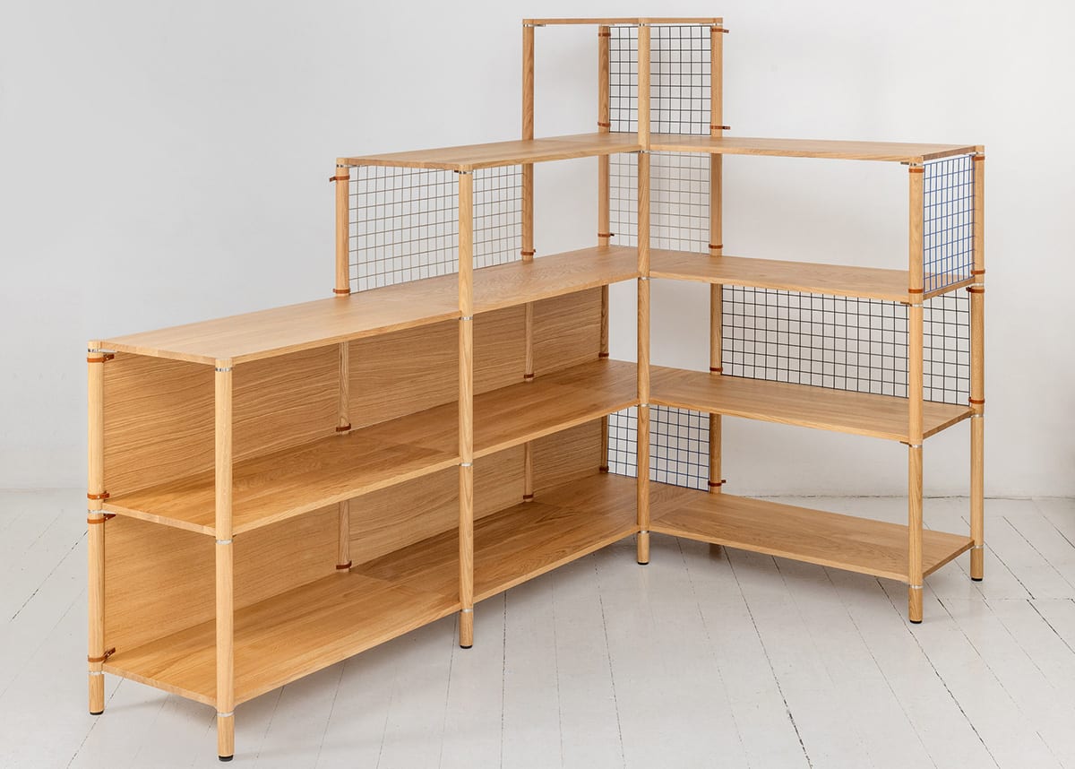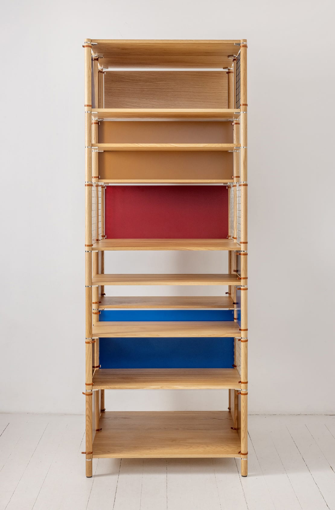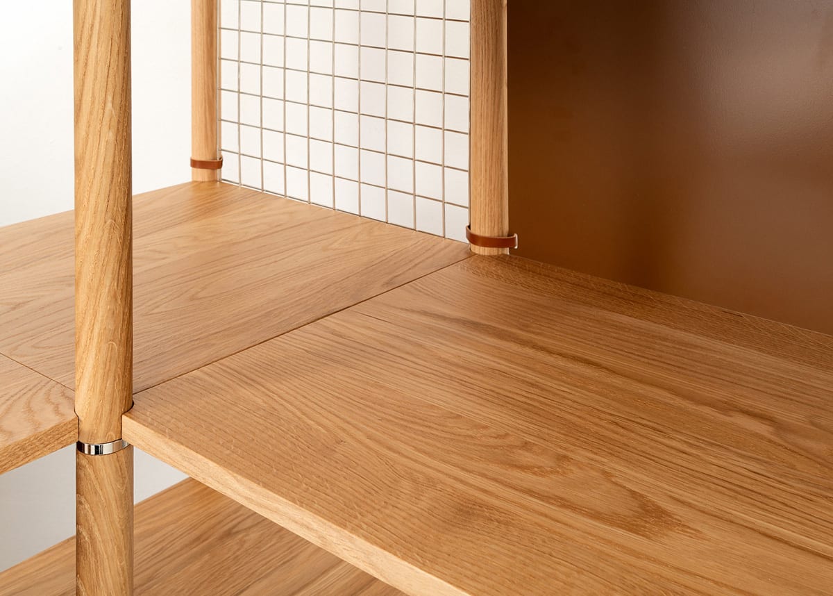The solid oak pillars come in various lengths, allowing for endless creative combinations. The shelves, made of solid oak, are available in rectangular, square, and wedge shapes, giving you the freedom to angle and adjust them just the way you like. As accessories, there are wooden walls, painted sheet metal, or metal wire panels, all attached with elegant leather straps.