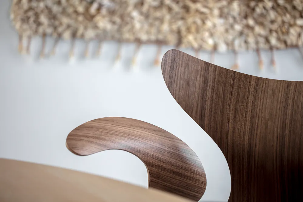 Natural Walnut makes this special anniversary edition both unique and historical. Until now, the Lily chair has never been released with a natural veneer exterior because it is extremely difficult to make the curved armrests without cracking the exterior veneer. The armrest angles and wood grain are complex compliments. When executed perfectly, they converge beautifully.