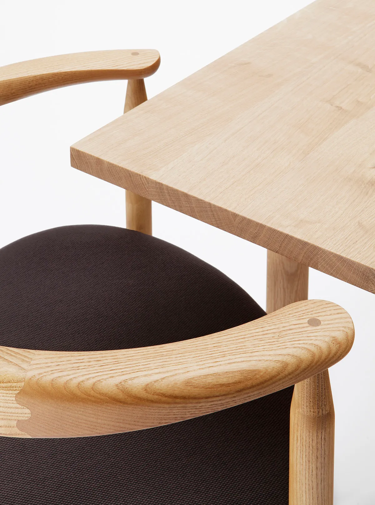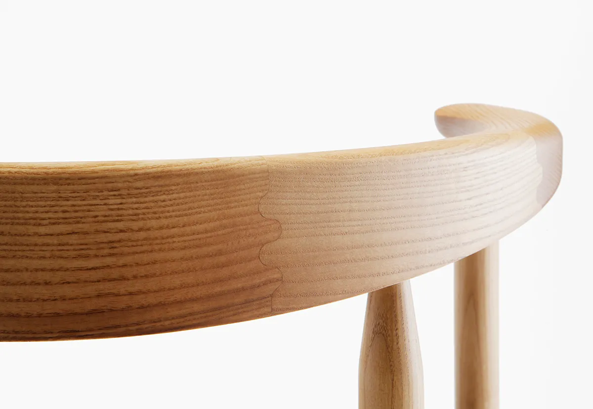 Designed in 2011, its distinctive horseshoe-shaped backrest features meticulously crafted finger joints, while mortise joints secured with wooden nails provide both structural support and aesthetic appeal.