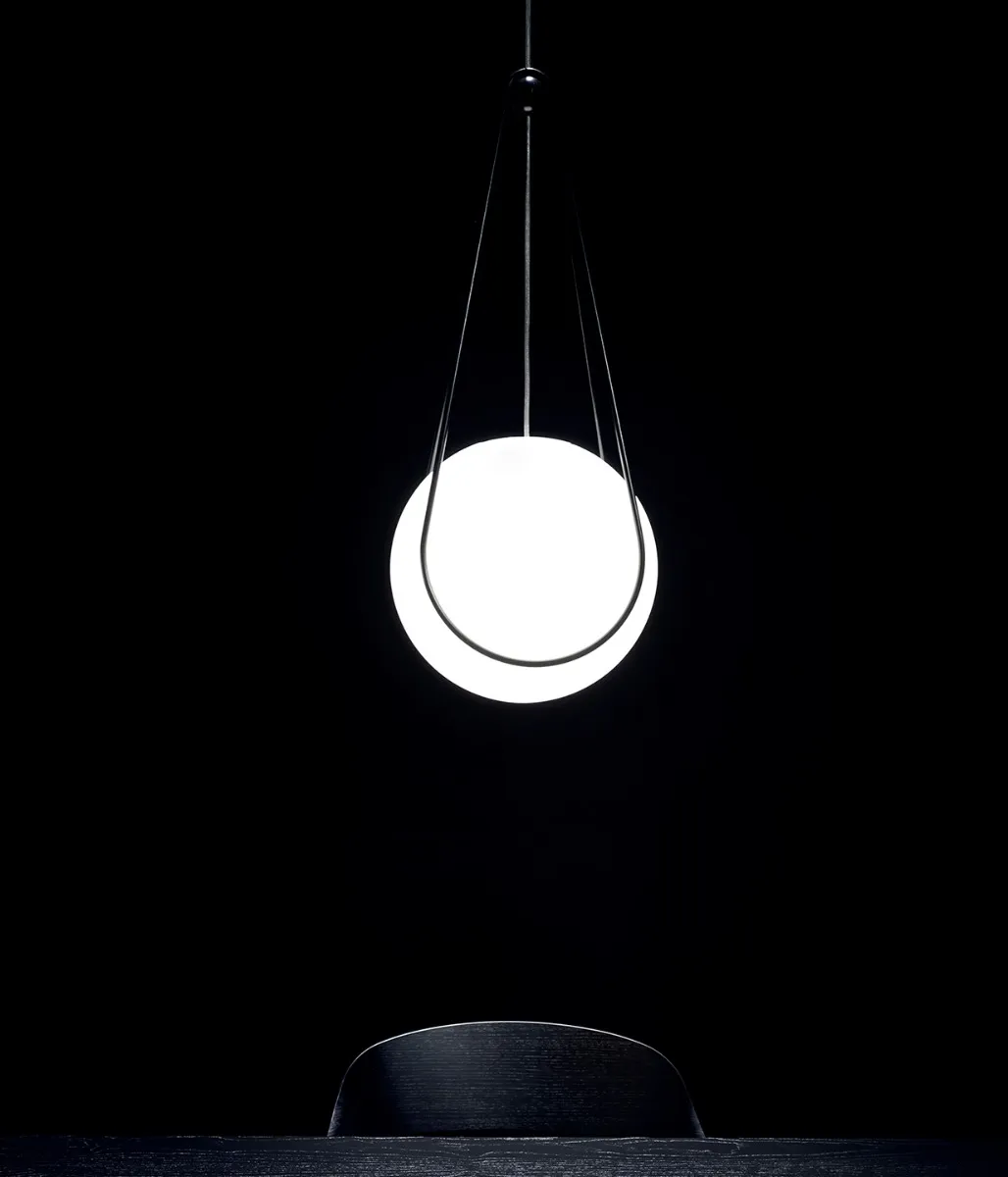 Luna is according to us the ultimate globe pendant. What? Yes, Alexander Lervik has created a unique globe lamp that doesn’t cast any shadows, it’s just pure uninterrupted light. How? All other globes on the market have some kind of metal or plastic lid to hide the cables and the hanging mechanism. Luna on the other hand is entirely made of glass, even the lid and the globe hangs on an acrylic cross designed to let the light shine through it while the cables and the hanging mechanism is built into just one cord. Luna is minimalistic and functional design at its core. Kosmos is the optional hanger for Luna. If you feel like the pure moonlight of Luna needs a more graphic expression or if you simply want to hang the moon.