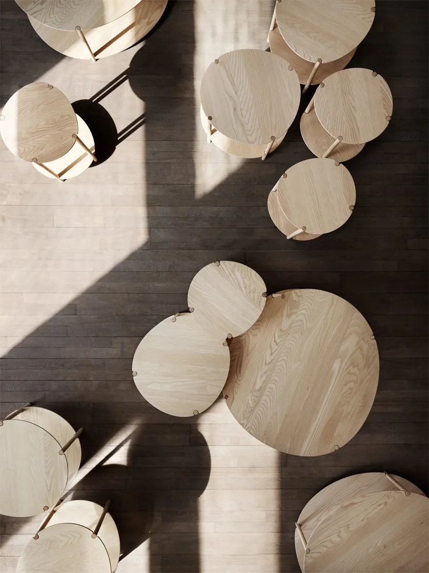 Lunaria’s personality relies on the use of soft and warm wood and its subtle, irregularly rounded table top shapes – reminiscent of how the moon’s disc can appear slightly squeezed due to refraction of the light by the earth’s atmosphere.