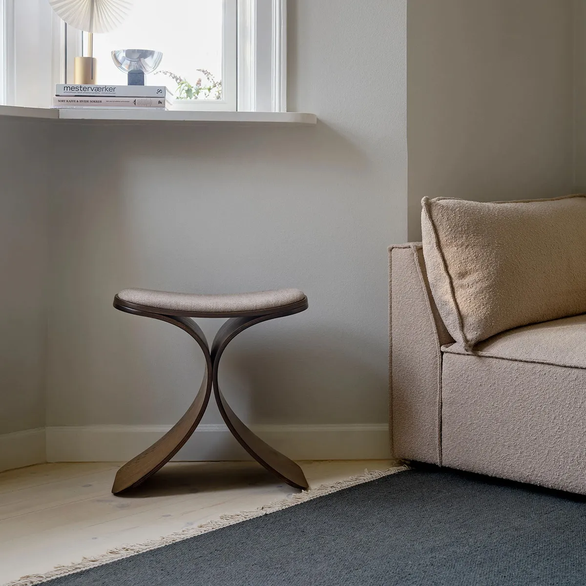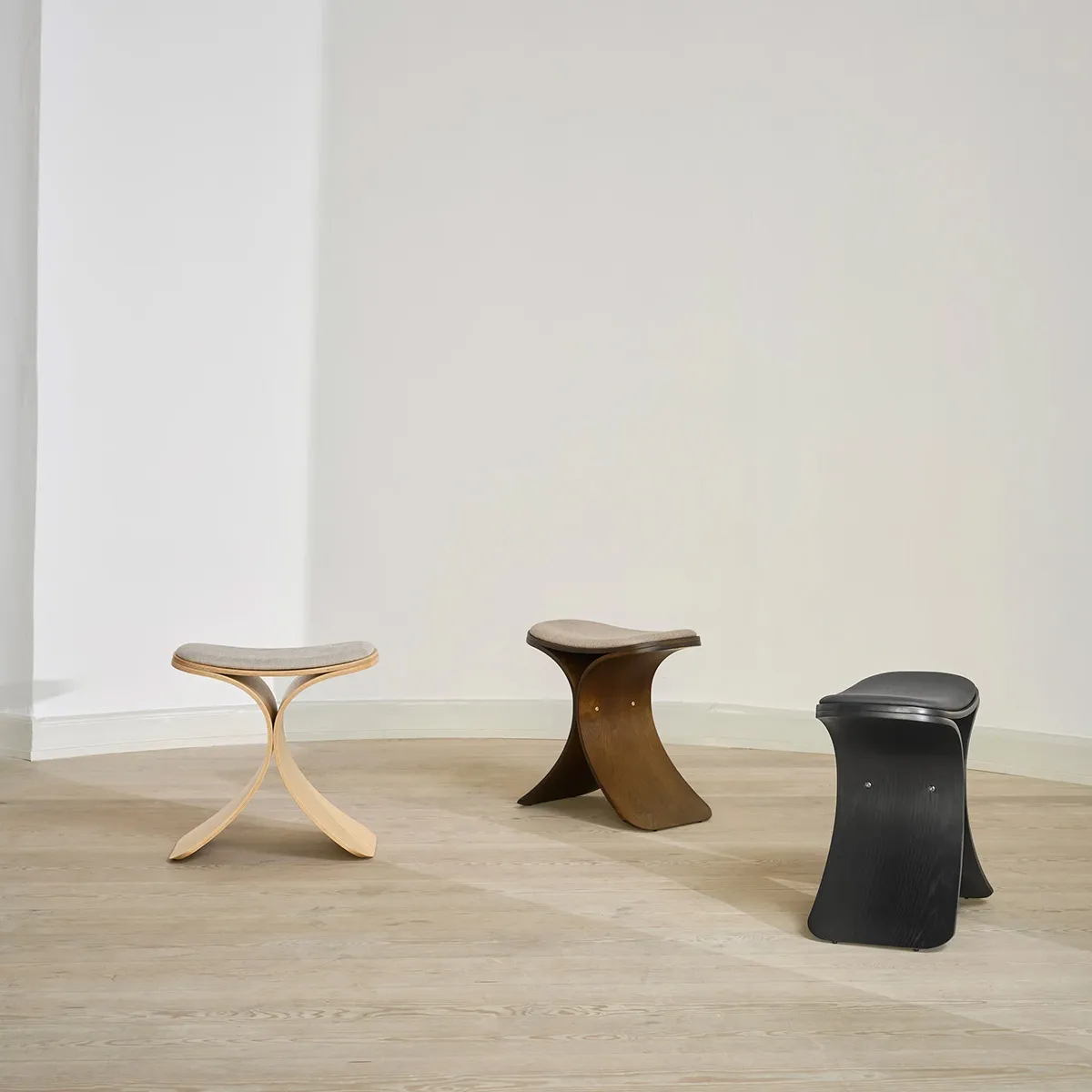 Luno is developed to stand freely in a room or be discreetly placed along a wall. Its organic shape creates a natural flow in the interior, while the carefully selected materials emphasize its solid quality. The stool comes in three elegant variations: dark oak with dark beige textile, classic oak with beige textile, and a sophisticated black oak edition with black leather. Regardless of the combination, each model is crafted to fit into various environments – from private homes to offices, hotels, and museums.