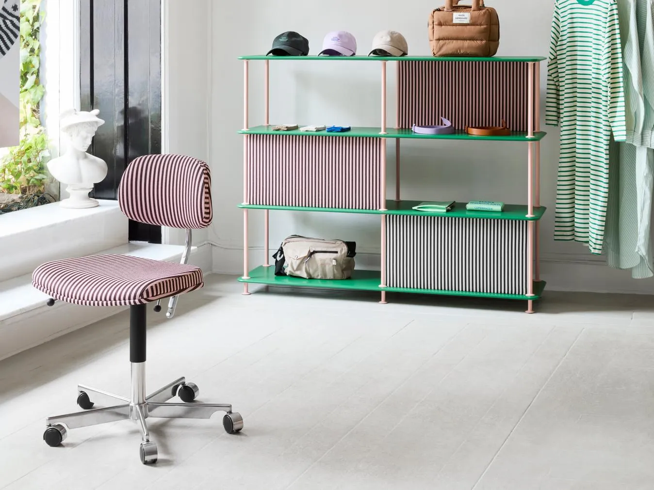 At the core of this collaboration lies Mads Nørgaard’s signature striped textile, expertly incorporated in the rich tones of Ruby and Balsamic, two standout colours from Montana’s palette of 41 striking hues. This textile seamlessly adorns the panels of the iconic Montana Free shelving system, infusing functional storage and display solutions with a dash of personality and flair. Furthermore, the textile enhances the upholstery of the renowned Kevi Office chair, elevating this classic piece into a statement of style and comfort.