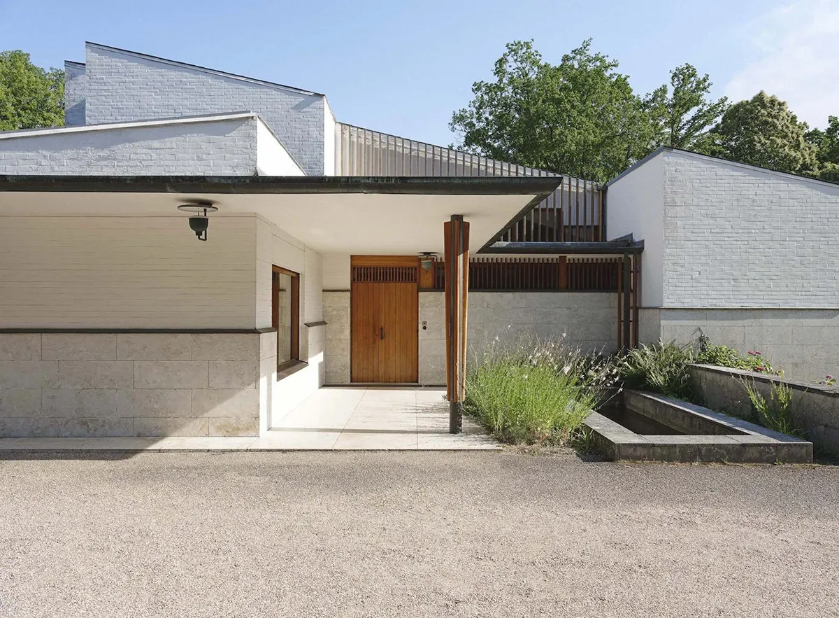 Exterior view of Maison Louis Carré showing Alvar Aalto's distinctive architecture with sloping roof and natural materials