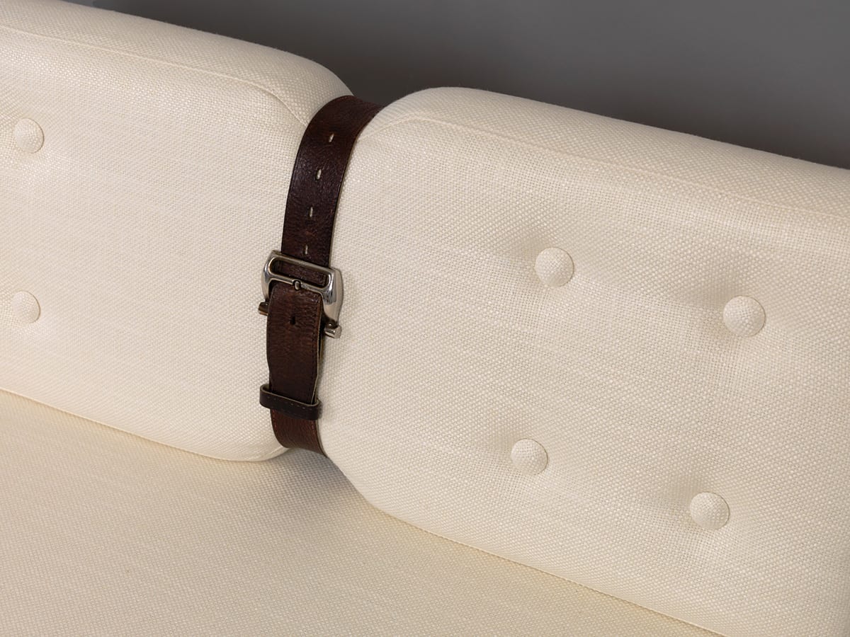 Legs in steel and turned wood covered with fabric. Leatherbelt.