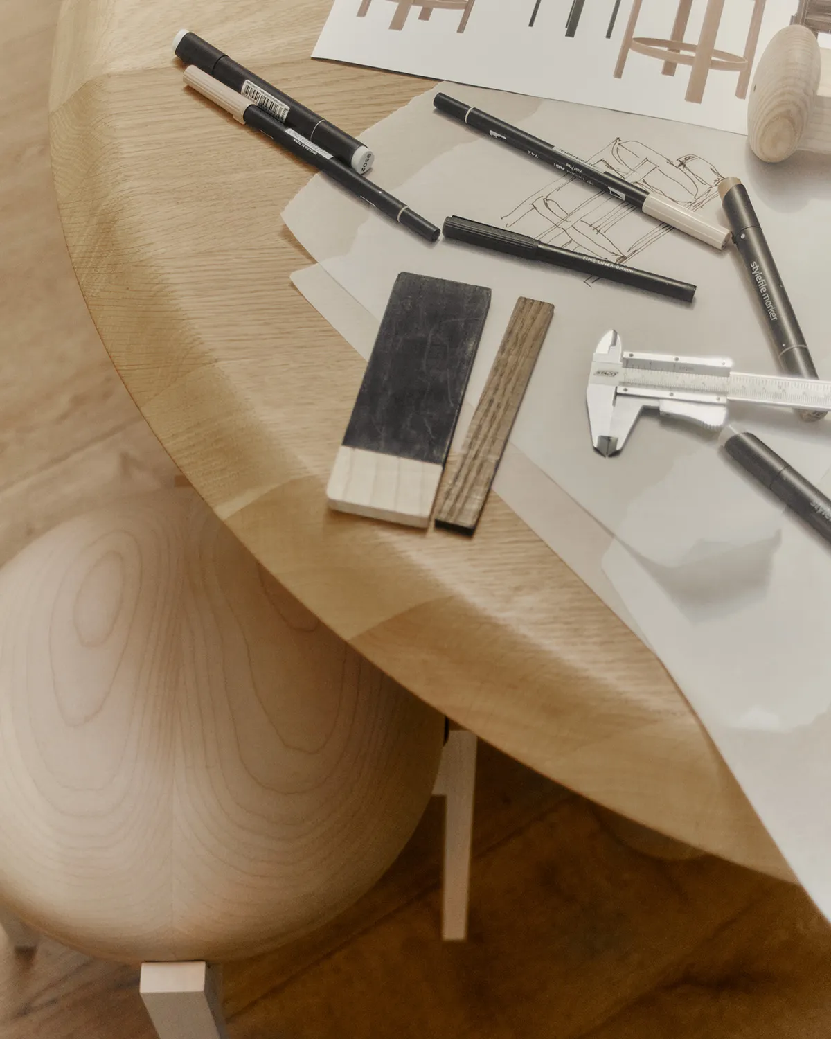 The Danish furniture designer Maria Bruun (b. 1984, based in Copenhagen) earned her master’s degree from the Royal Danish Academy of Fine Arts in 2012. In recent years, she has received Denmark’s two most prestigious design awards: the Wegner Prize (2022) and the Finn Juhl Prize (2021). She has gained international recognition for her innovative and sculptural designs, showcasing a deep understanding of the natural properties of wood, exemplified by the acclaimed Pioneer stool and the Islets table for Fredericia.