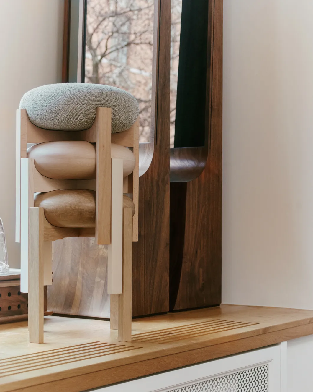Inspired by Bruun’s own experiences from the period, including her growing need to surround herself with beautiful things and meaningful materials, the small collection Nordic Pioneer was born, including a stackable stool with a solid maple seat that was exhibited as part of the project at the Design Museum in London. Drawn by the sculptural, beautiful wooden object, Bruun and Fredericia Furniture have further developed the piece into a stool and a bar stool at two heights with an upholstered seat, transforming the artistic and sculptural idea into a functional piece of furniture.