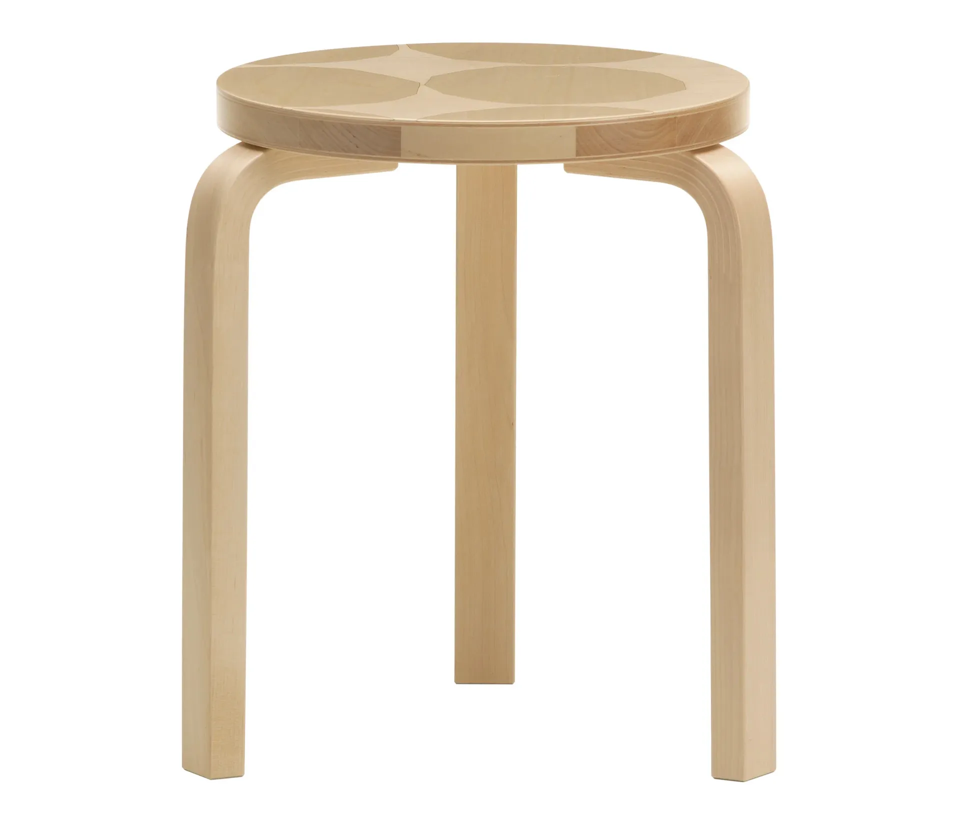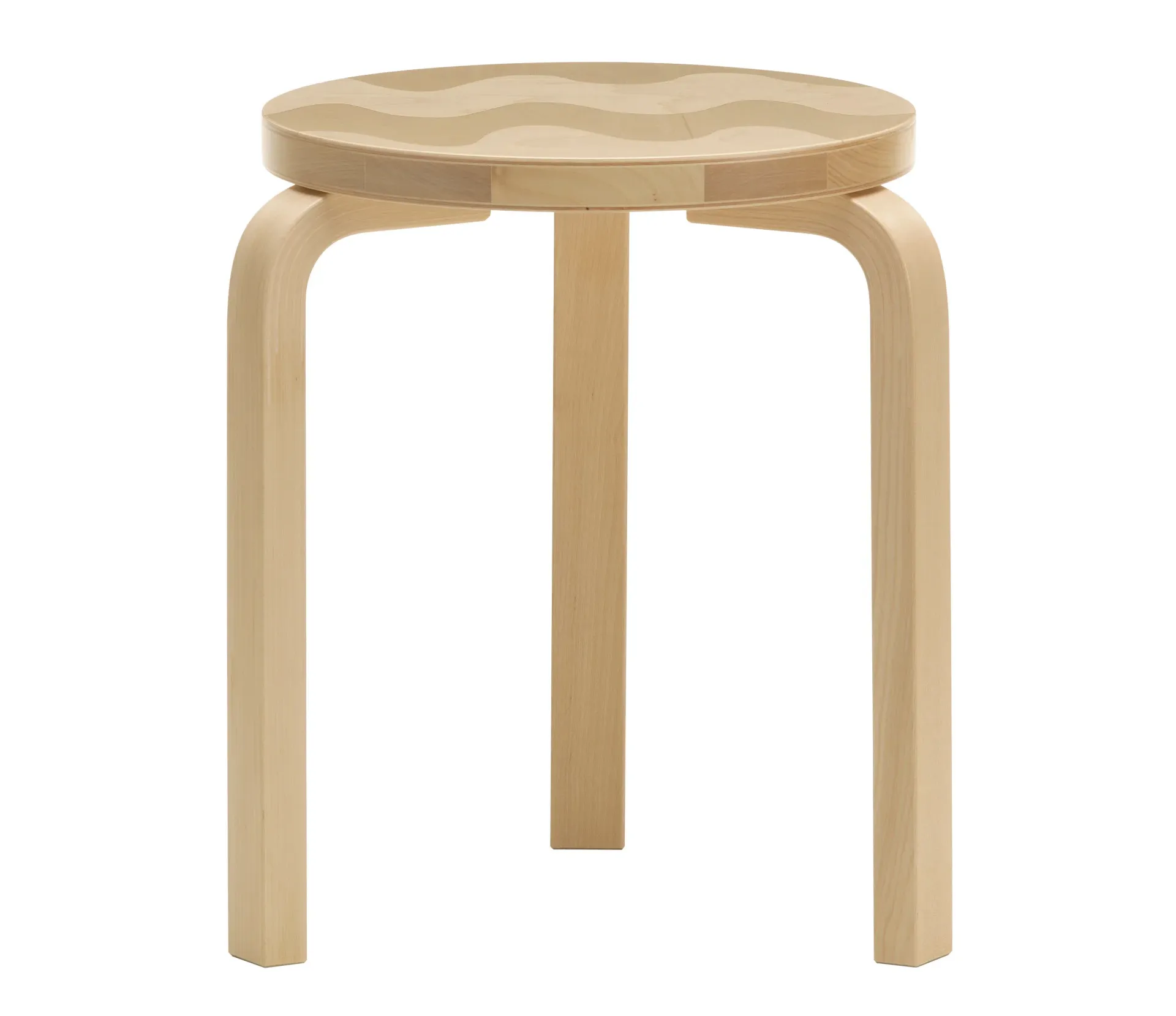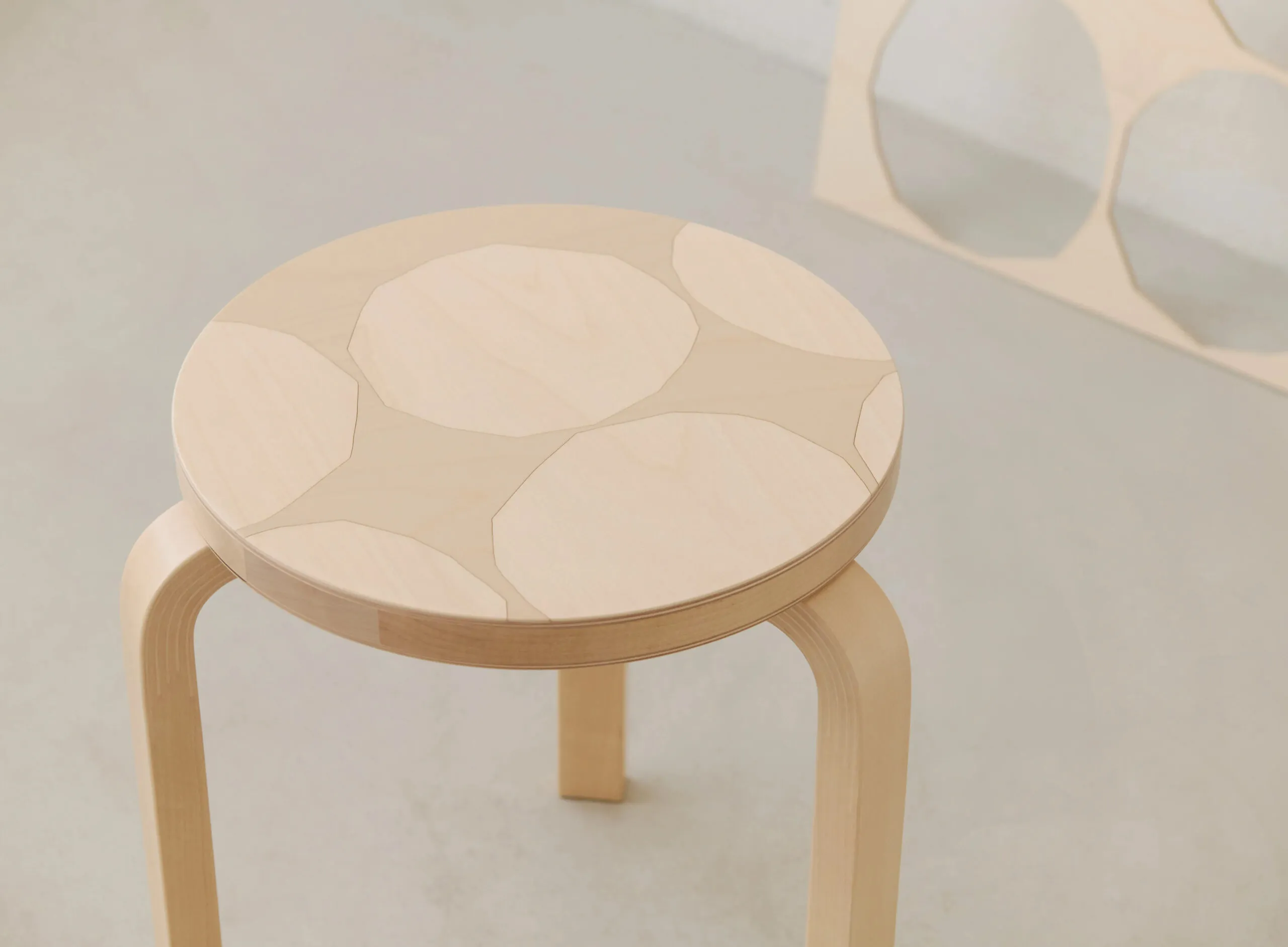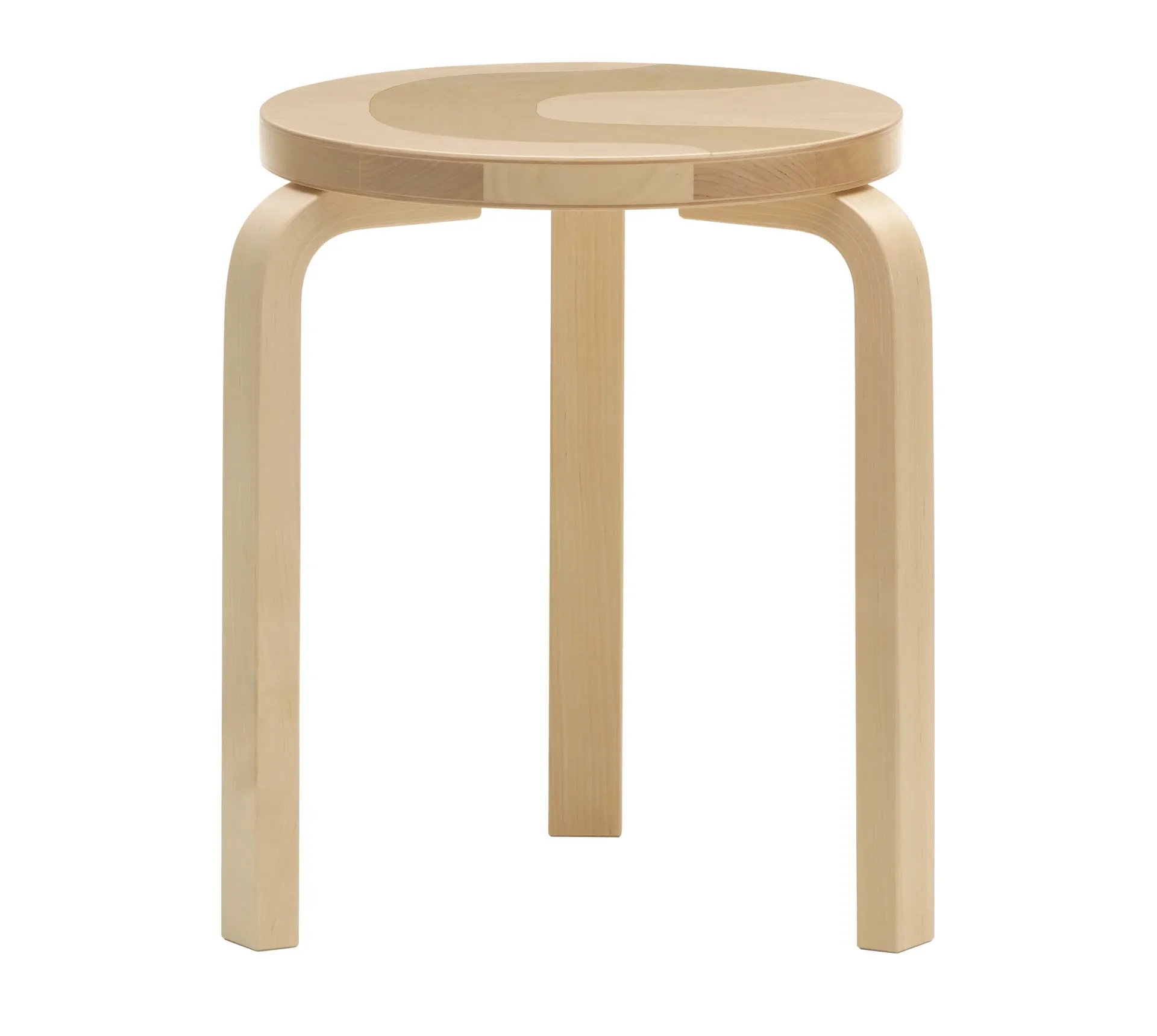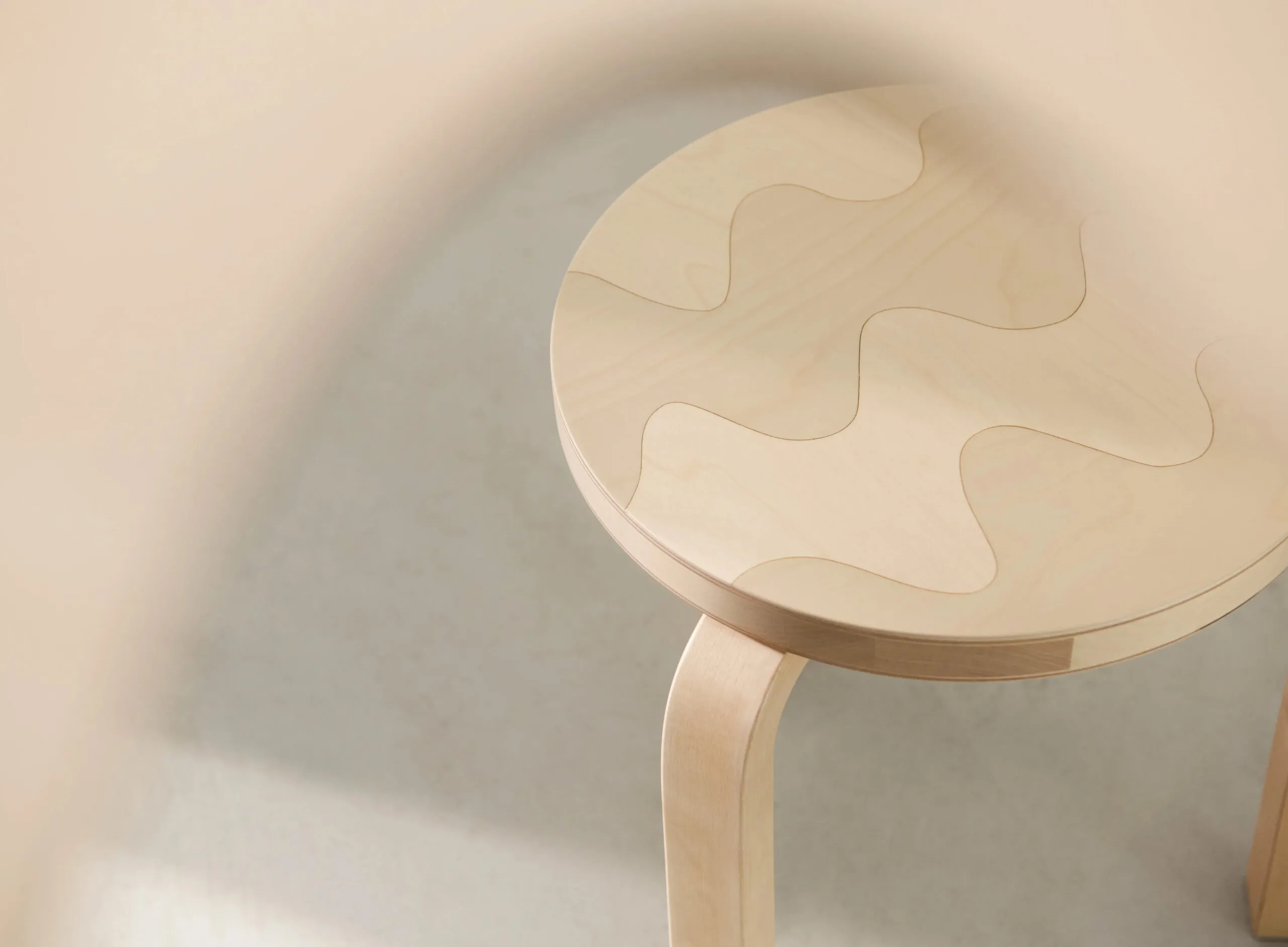 Stool 60 Seireeni Alvar Aalto’s 1933 stool featuring Maija Isola’s Seireeni pattern (1964), inspired by water movement in Greece. Marquetry technique creates shimmering effects on Finnish birch.