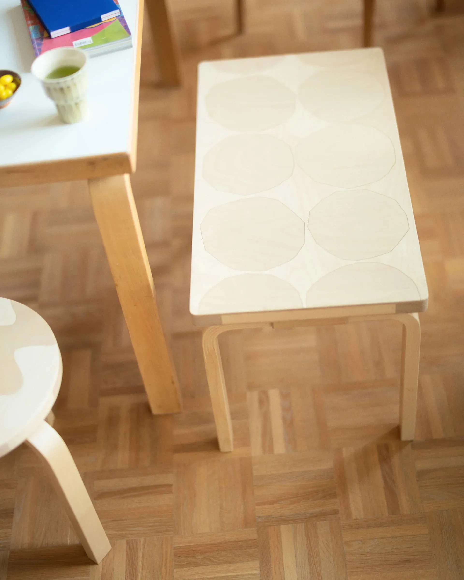 This collaborative collection merges Marimekko’s art of printmaking and Artek’s technology of wood bending. Some of Marimekko’s most iconic prints by designer Maija Isola combine with the purity of Alvar Aalto’s Stool 60, Table 90D and Bench 153B. Each pattern is applied using marquetry on birch veneer, where contrasting wood grains translate Isola’s vibrant patterns into a subtle, shimmering surface. The collection celebrates what unites two iconic Finnish brands — bold and distinct identities shaped by architecture, nature and human-centric pragmatism. It reflects Artek and Marimekko’s pursuit of long-lasting design, and the marquetry production process minimises wood waste. All products are made from responsibly sourced Finnish birchwood at Artek’s factory near Turku in south-western Finland.