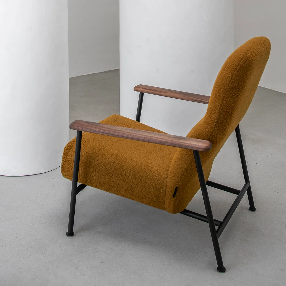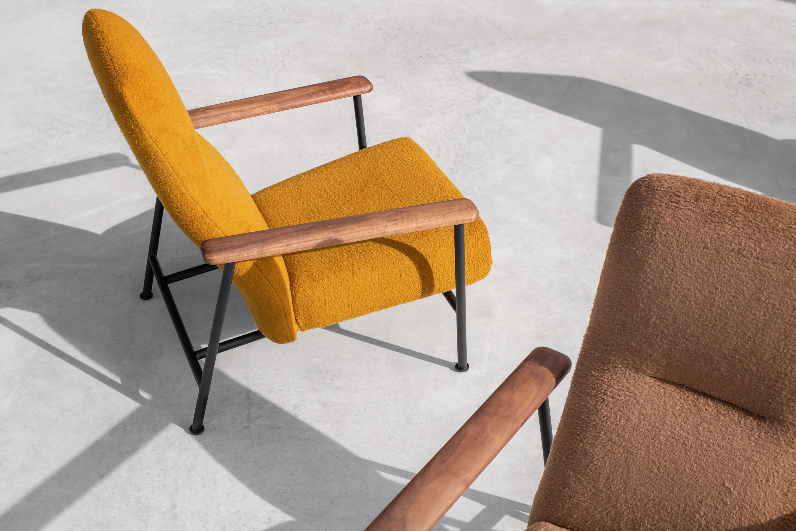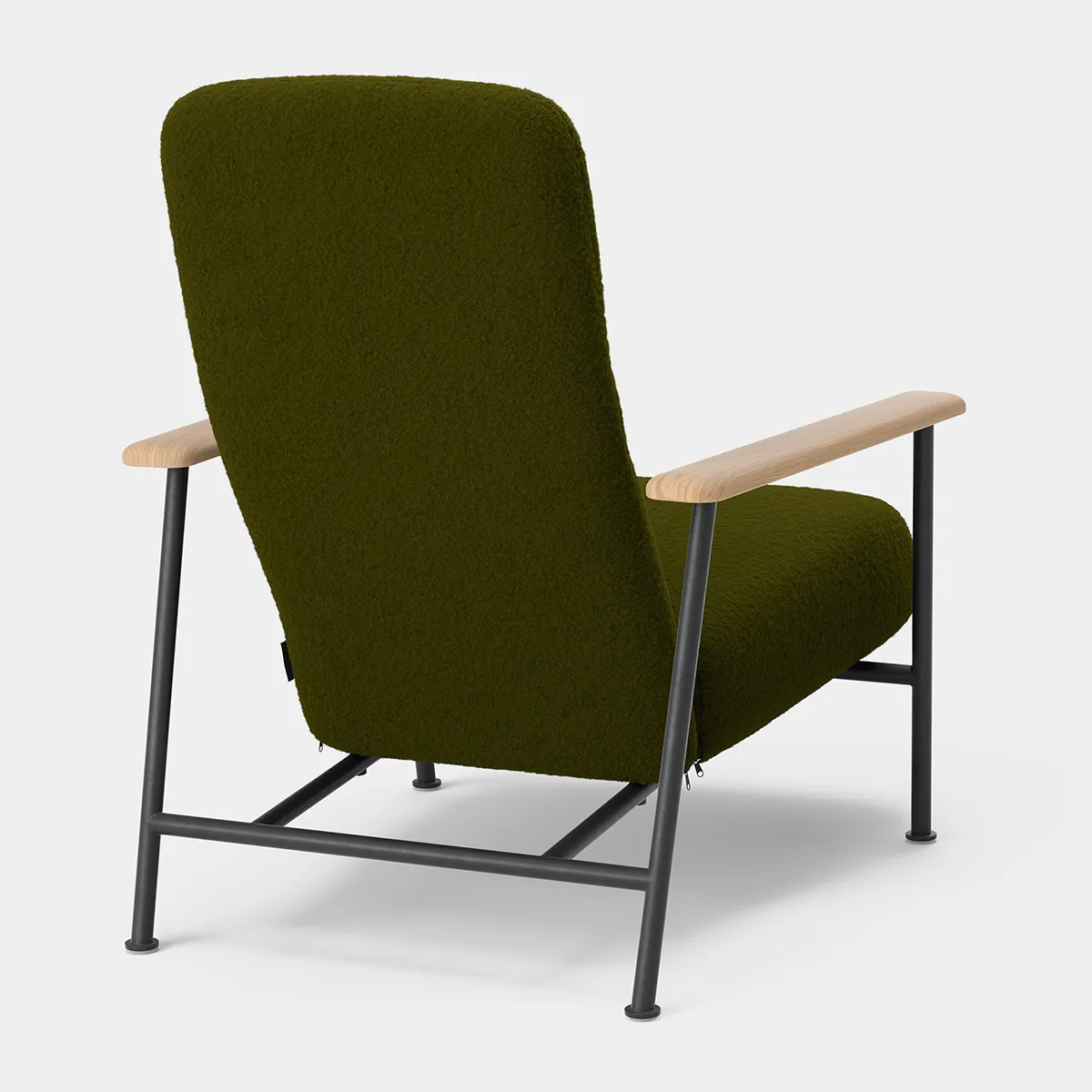 Massproduction’s design manager Chris Martin wanted to realize an idea for a visible steel frame, which, like a skeleton, creates the structure and carries the other parts of the body. Jump’s backrest is easily mounted in the steel frame for flexibility, high comfort and gives the impression of floating freely in the frame. In contrast to the steel frame, rounded armrests in oak or walnut are added.