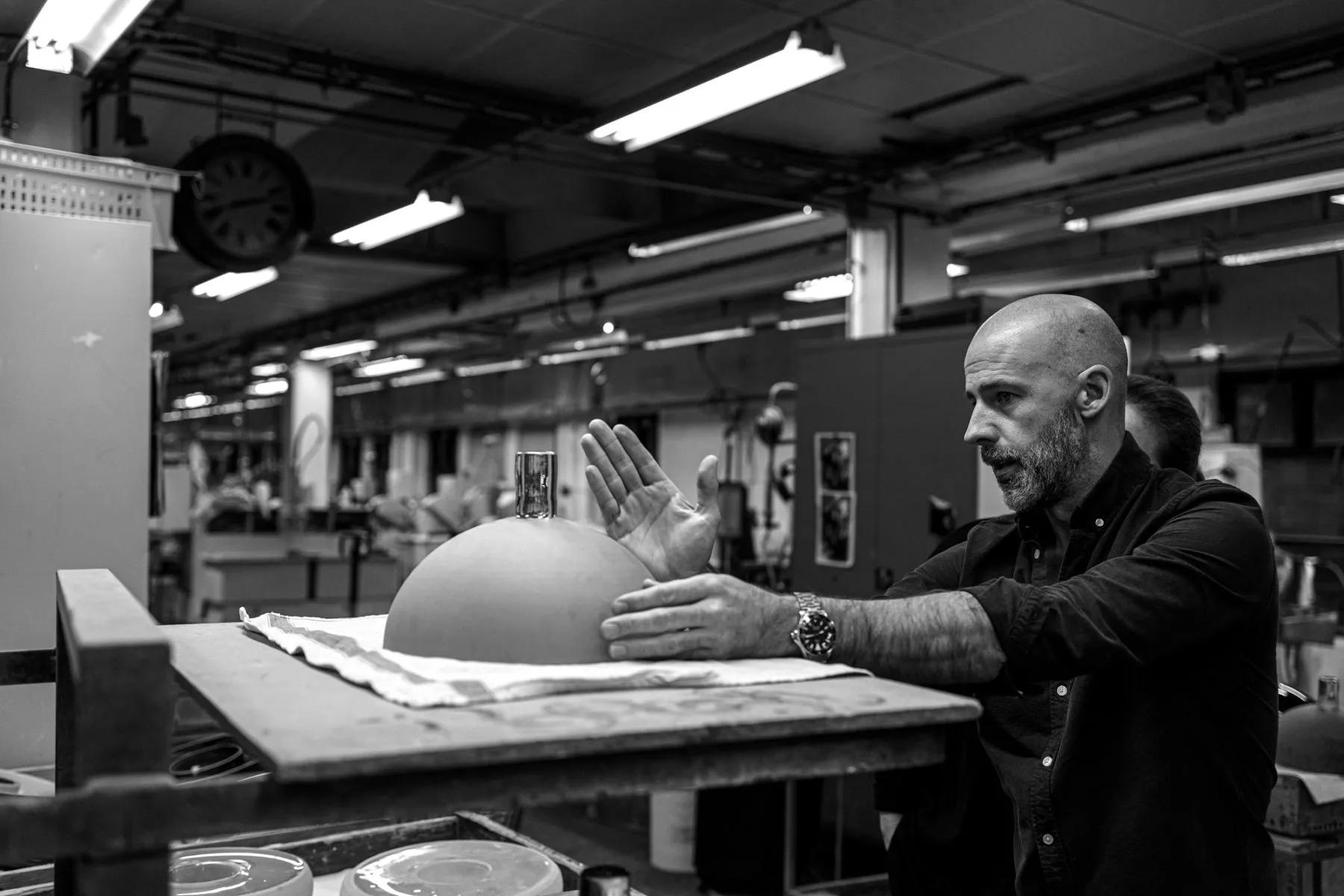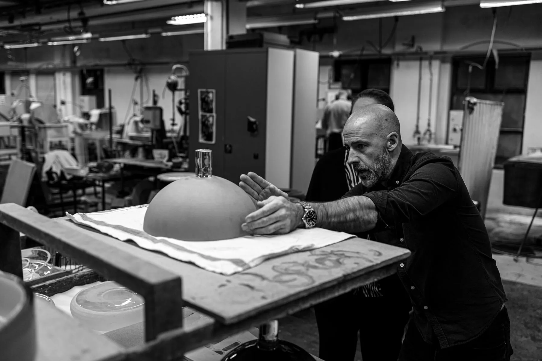 It is interesting to combine blown glass with architectural materials such as stone and steel where we can control dimensions in the tenth of a millimeter. The fact that we master the combination of the precise steel and the stone with the temperamental glass makes us unique in the glass art. It also requires a lot of work in the grinding plant, which is unusual as we in Sweden traditionally have our strength in the hot glass. ”