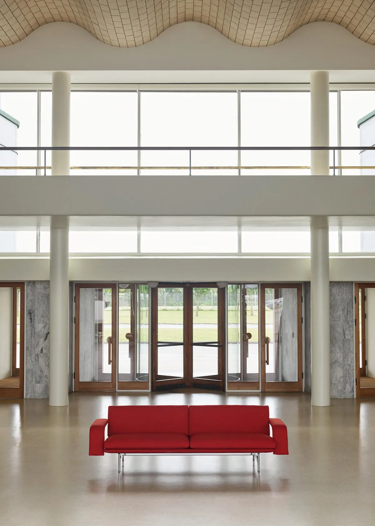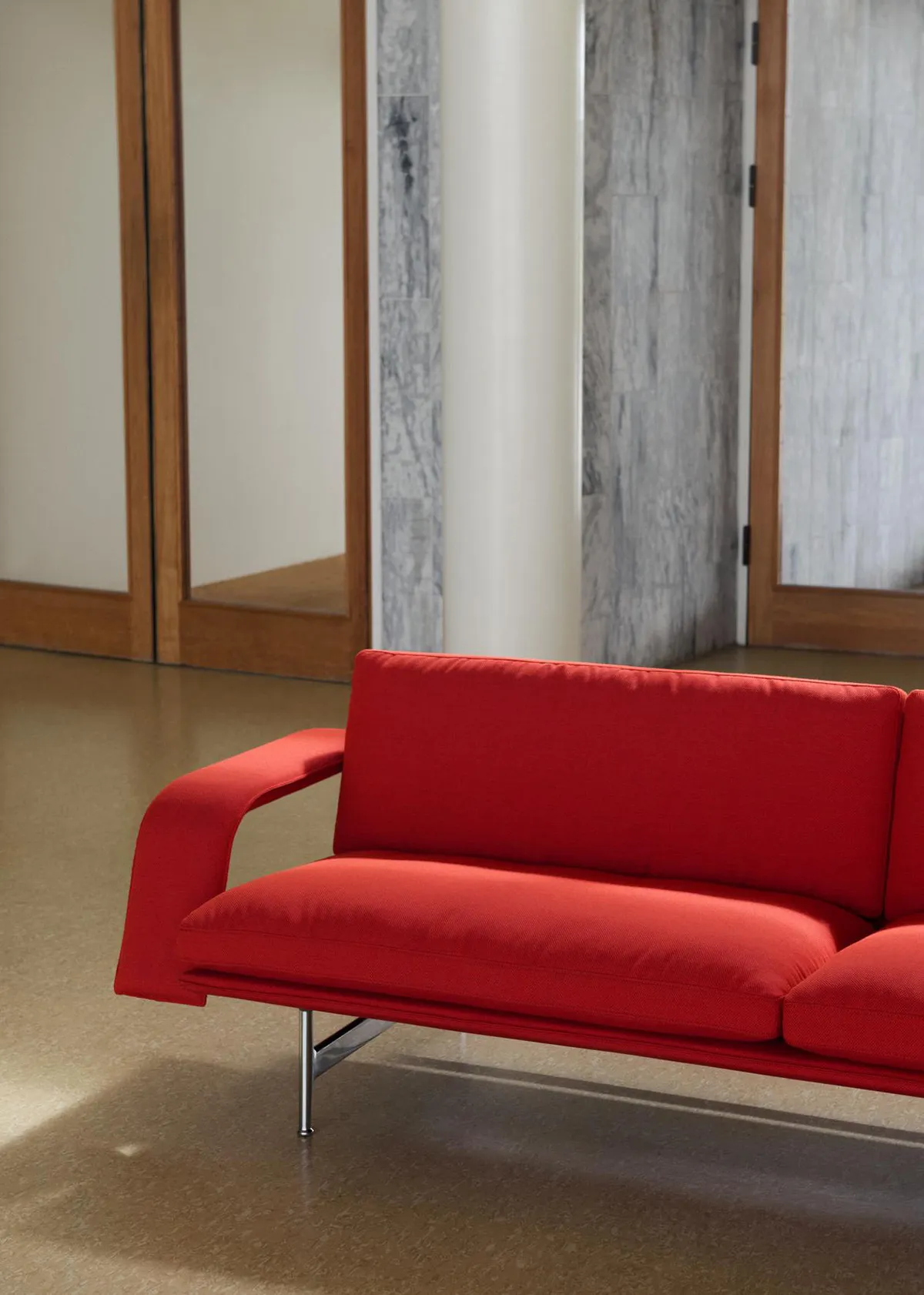 Composed of a light shell frame that rests in a cast aluminium crib, loose, slim cushions configure to present a solid sofa body with parallel lines that run perpendicular to the outwardly reaching armrests – the collection’s defining feature.