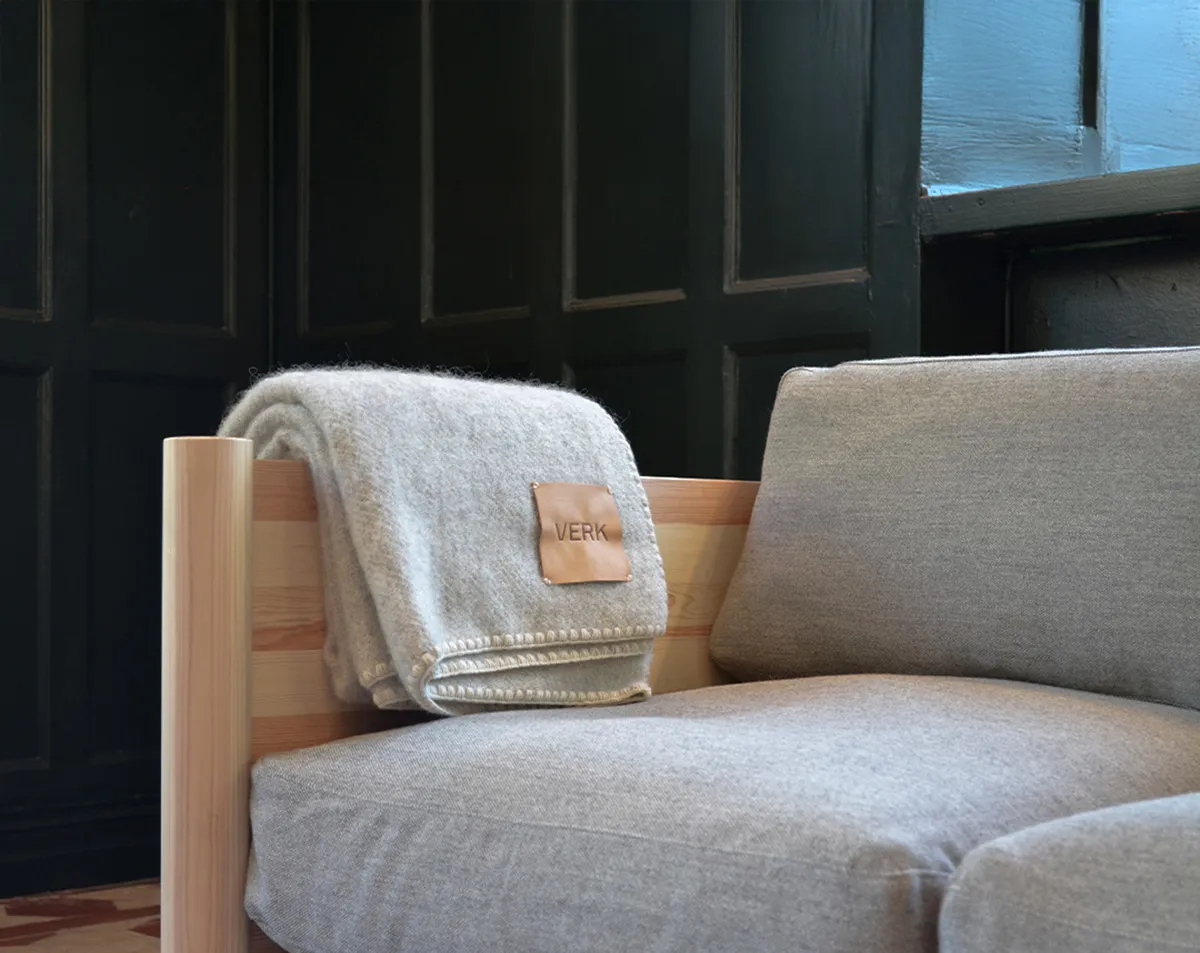 Råman’s V.IR.02 and V.IR.04 cushion designs complement the sofa’s natural palette. Verk adds the V.TP.01 wool blanket to complete the all-Swedish wool collection. The styling emphasizes domestic material sourcing and ecological processes.