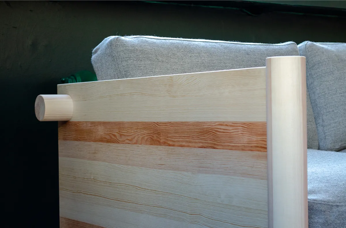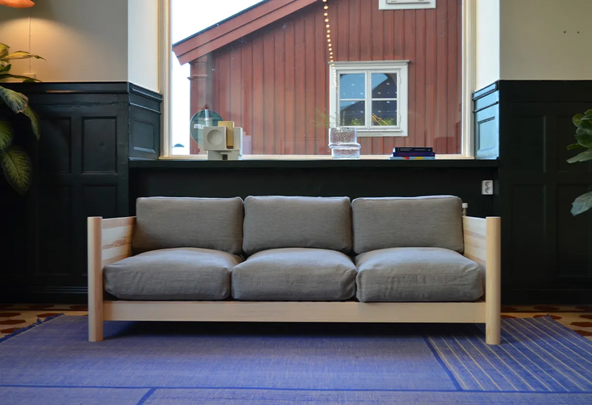 Verk pairs Mia Cullin’s pine sofa with Ingegerd Råman’s textile designs, uniting two Swedish designers through natural materials. Cullin’s sofa features solid pine or oak construction with ecological leather cushions filled with Swedish wool.