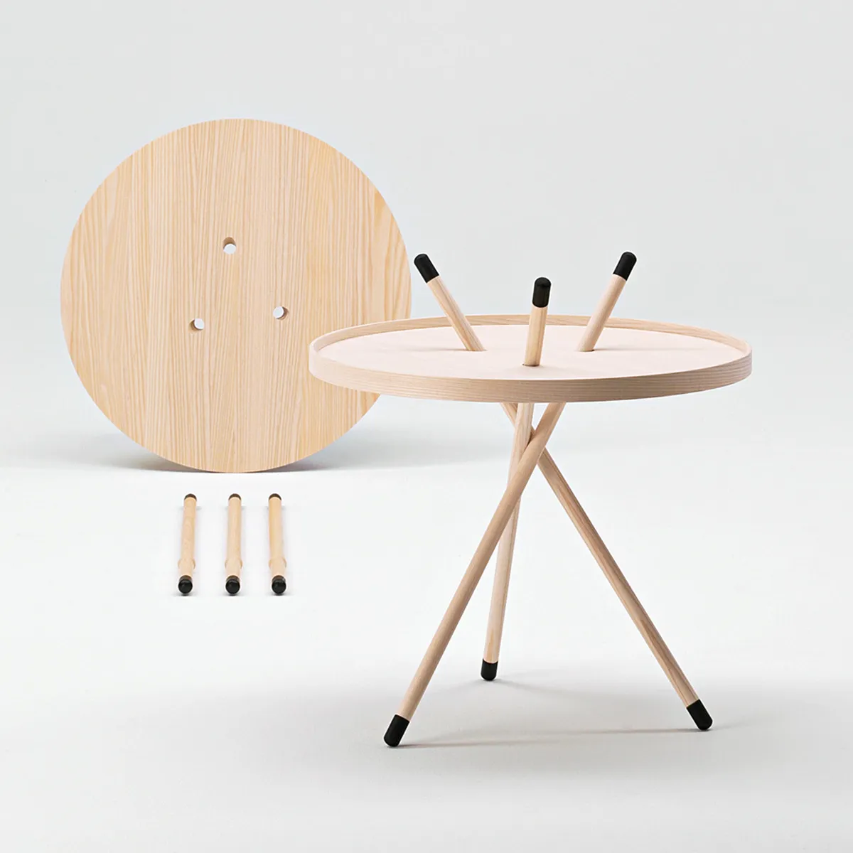 As the name suggests, it was the game of pick-up sticks which gave Cecilie Manz the idea for this small, three-legged table. “Using sticks, I experimented to see how it was possible to construct a piece of furniture which was easy to assemble and disassemble. It resulted in a table with a nearly archetypal, three-legged construction – similar to the classic hunting chair with a leather seat,” says Cecilie Manz, who trained at Danmarks Designskole. She has refined the design so the table can be assembled without using screws or hinges. The round tabletop and the three legs interlock when the table stands on the floor.