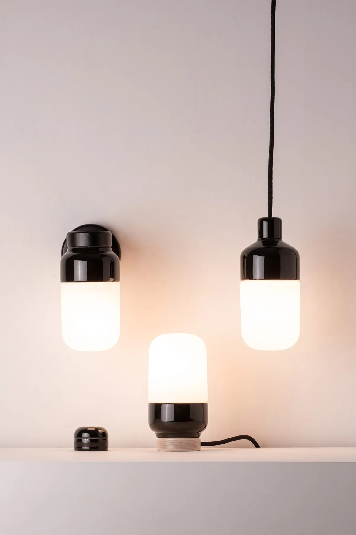 All new and previous Ohm luminaires are designed with modularity and adaptability in mind, sharing porcelain bases and a glass shade program across the entire collection, binding together the collection and the different areas of use. The porcelain bases come in two sizes, high gloss glazed in black or white. The white opal glass shade comes in two heights. One for a short dense appearance, and a long shade for a more stretched silhouette. The clear glass option gives a warm and airy ambience, revealing the high gloss glazed luminaire construction.
