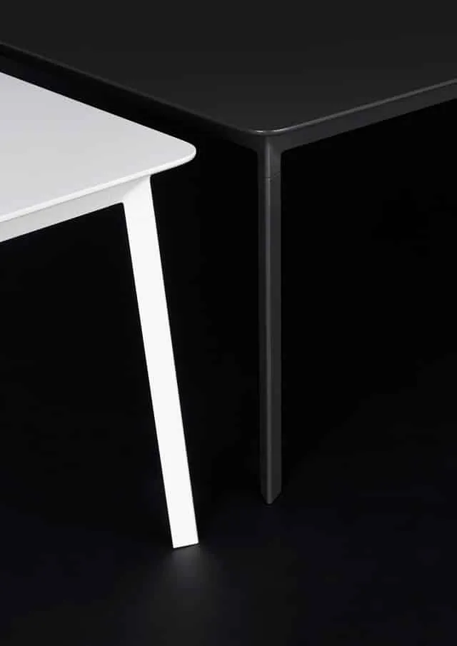 Table with top in white laminate F2255 and frame in white lacquered metal RAL 9003, or top in graphite-coloured laminate F7837 and graphite-coloured lacquered metal RAL 8019.