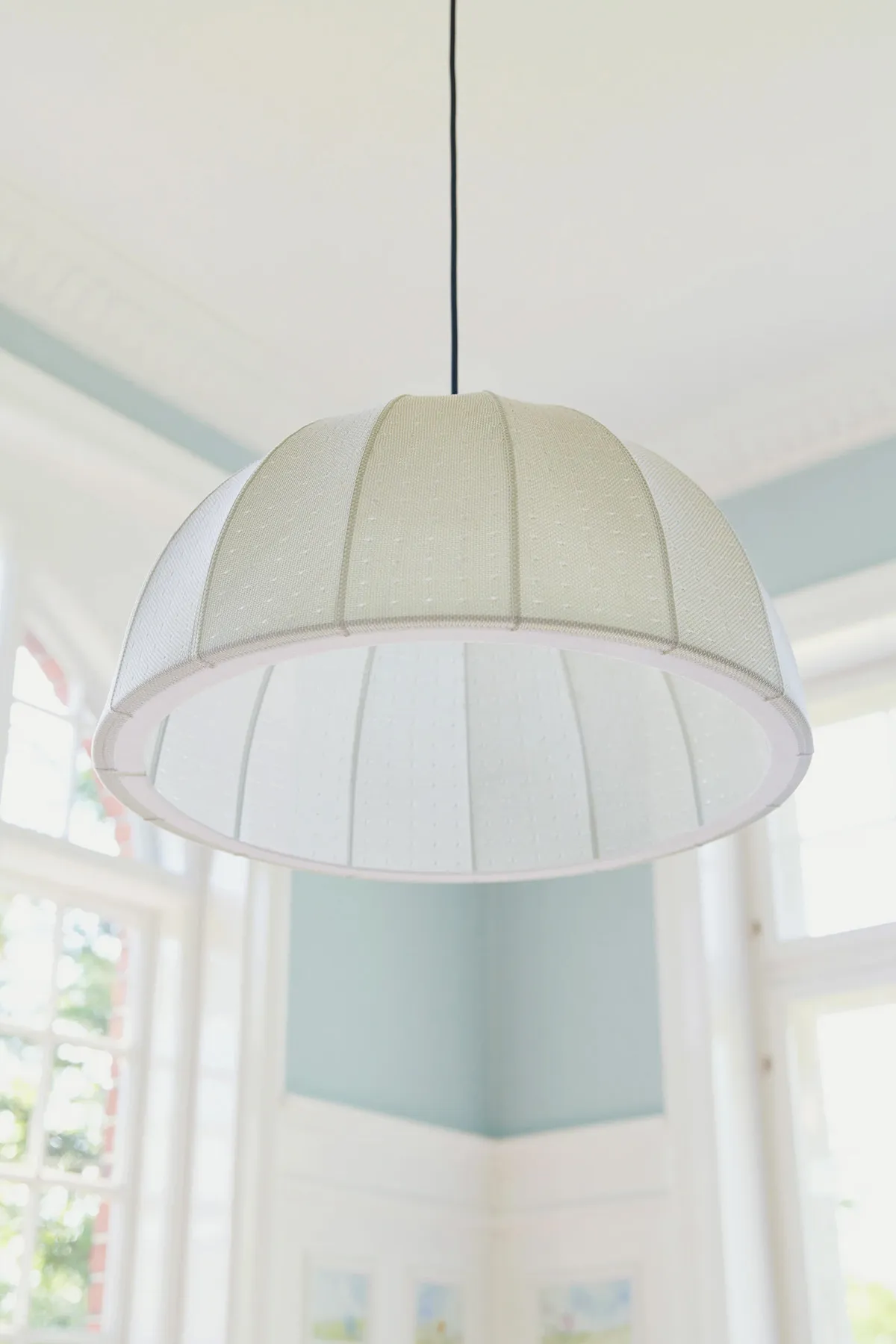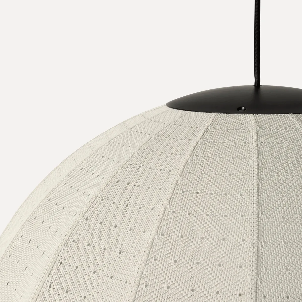 Most of the LED light is effectively directed downwards, but the light is also diffused by the fabric and provides a soft ambience to the room. The knitted pattern lets the light through and emphasizes the shape and the architectural character of the lamp.