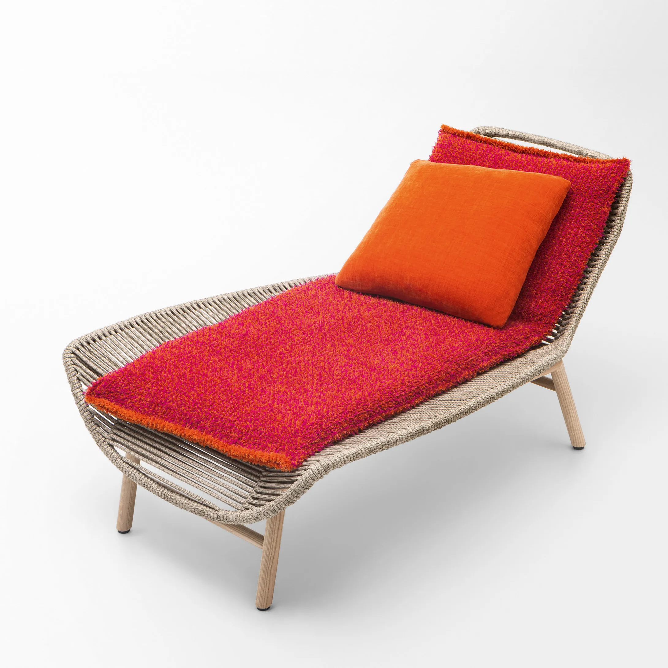 This distinctive chaise longue features a luxurious fur-like throw that partially covers the webbing structure, creating a fascinating dialogue between form and textile. “We thought it interesting to translate the expression of a tufted carpet into a chair, both for the comfort it provides and for the added material richness,” explains the studio.