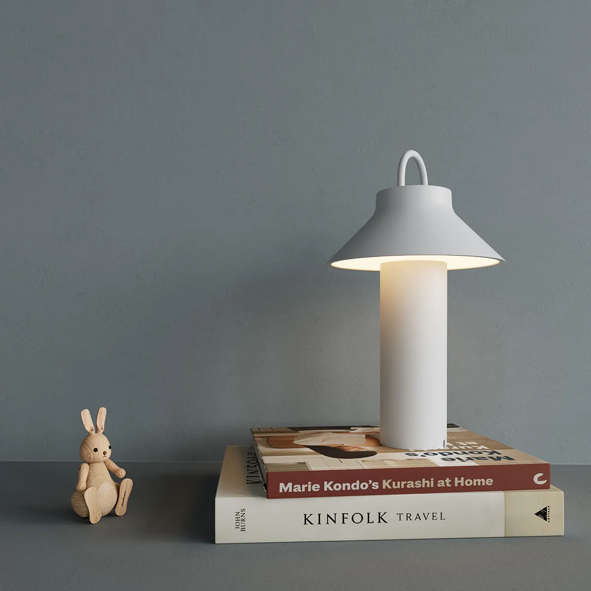 The lamp combines minimalist aesthetics with functional versatility, offering cordless illumination for both indoor and outdoor environments.