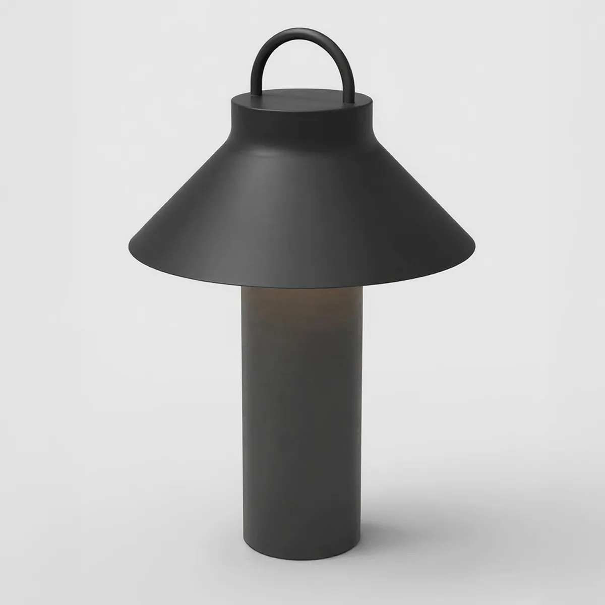 The powder-coated metal construction ensures weather resistance and durability, while the matte finish provides a tactile quality that distinguishes the lamp from glossy alternatives. The cylindrical form offers stability on any surface, and the integrated handle serves both functional and aesthetic purposes, creating a visual balance in the lamp’s overall composition.