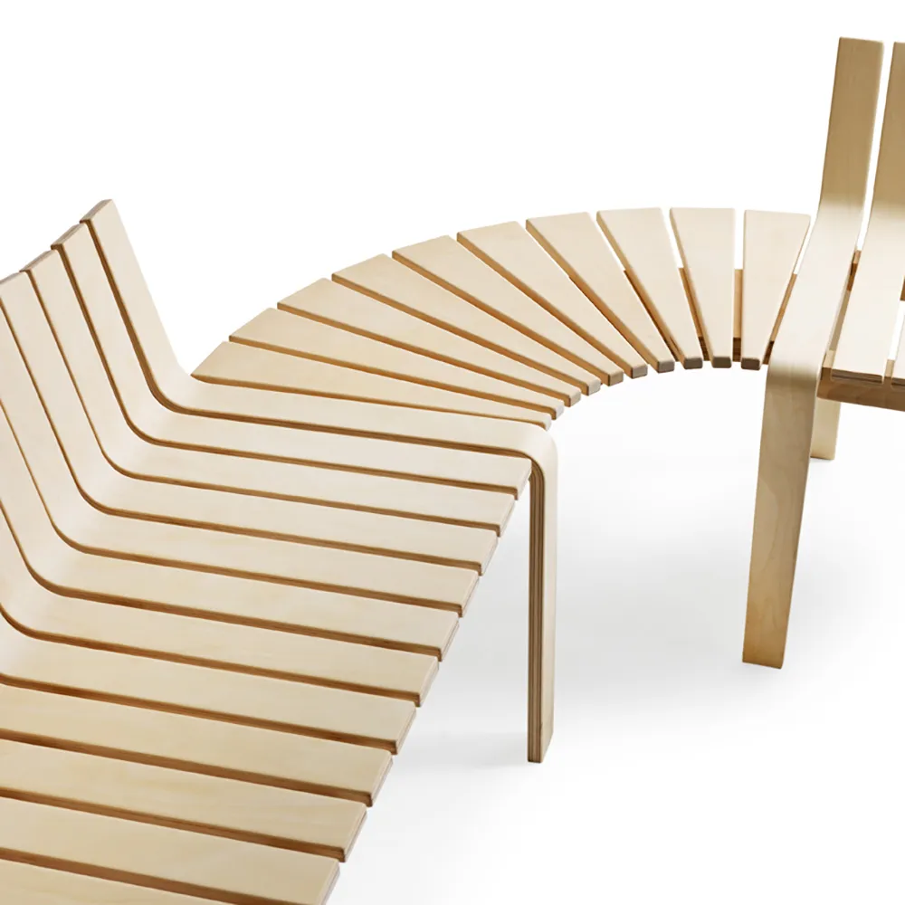Bench in natural birch or stain. Comes in right or left versions. When benches are linked their asymmetrical form creates a wave-like movement. The bench can also be linked to a table at 45 or 90 degrees.