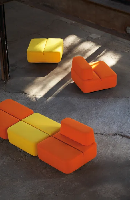 It consists of only two modules: a seat with a backrest and a seat without a backrest, which can be combined for the solution that best suits your space. The backrest version can also be used alone as an armchair.