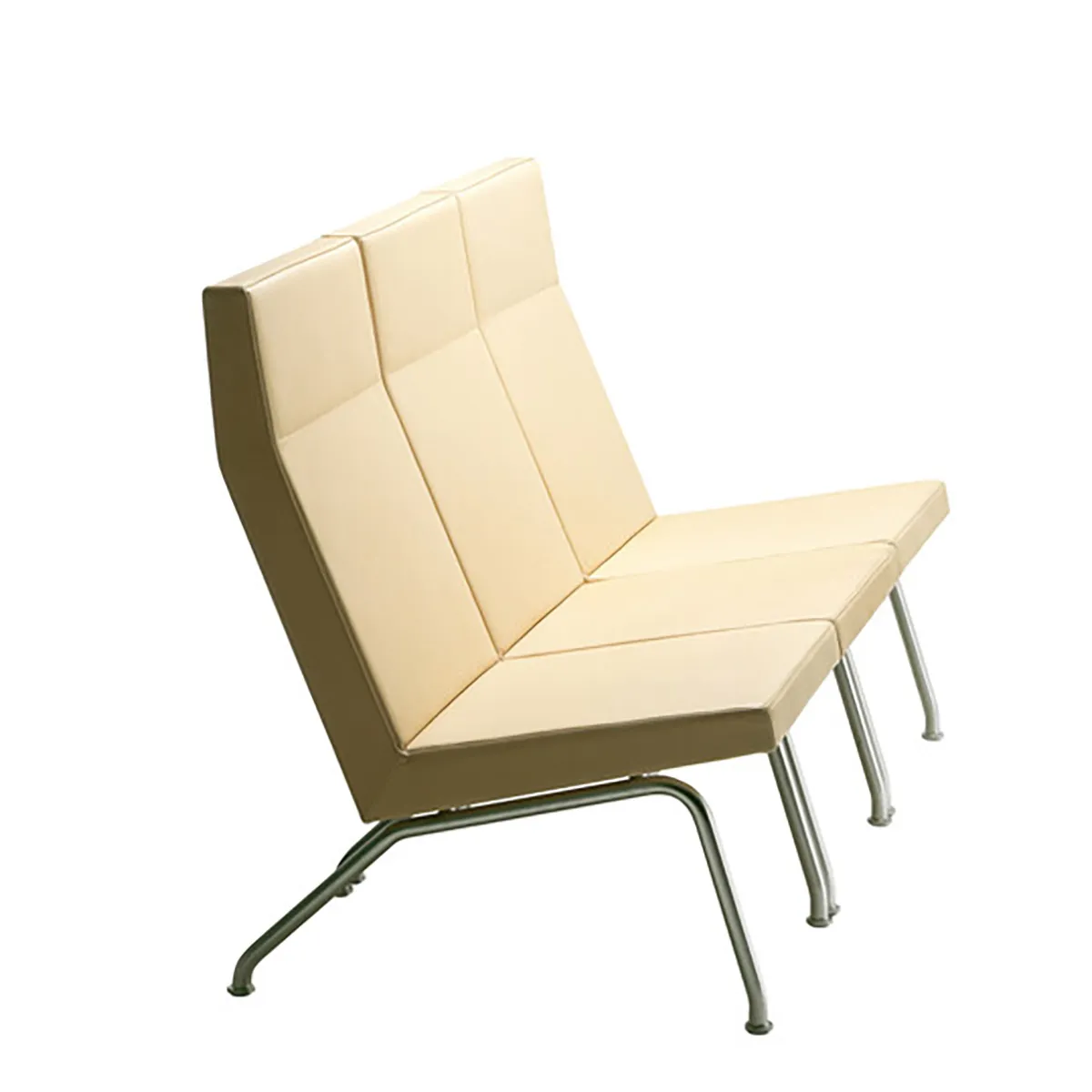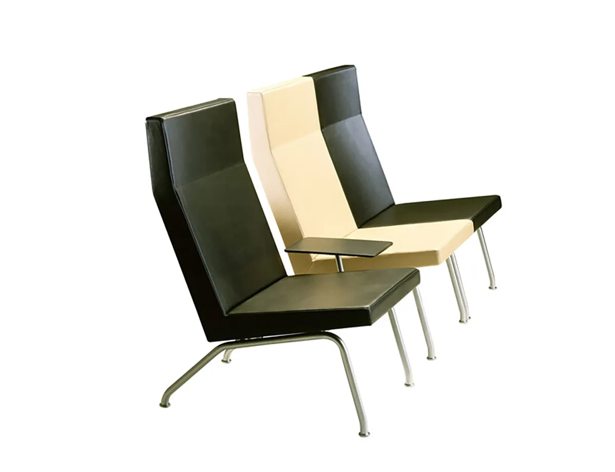 Multiplicity is an easy chair for public areas as well as private homes, and can be used separately or in multiplicity in bigger areas, e.g. airport lounges etc. Anya Sebton has designed the chair with inspiration from aircraft seats; it has a clean, minimalistic appearance, in combination with high comfort. The airport thought can also be seen in an extension of the name Multiplicity; multiple cities – a product for airports connecting places and people. The most prominent part of the chair is the distinct, high back, which, together with the inclination angle of the chair, gives good support. Multiplicity has a frame of laminated wood with polyurethane foam upholstery, mounted on steel tubing. The easy chair can be upholstered with fabric or leather. Furthermore, this easy chair is linkable, and, as an alternative, it can be provided with a small tablet between the chairs. At a later stage, a separate table will be added to the Multiplicity family. Multiplicity – a product offering multiple variations.