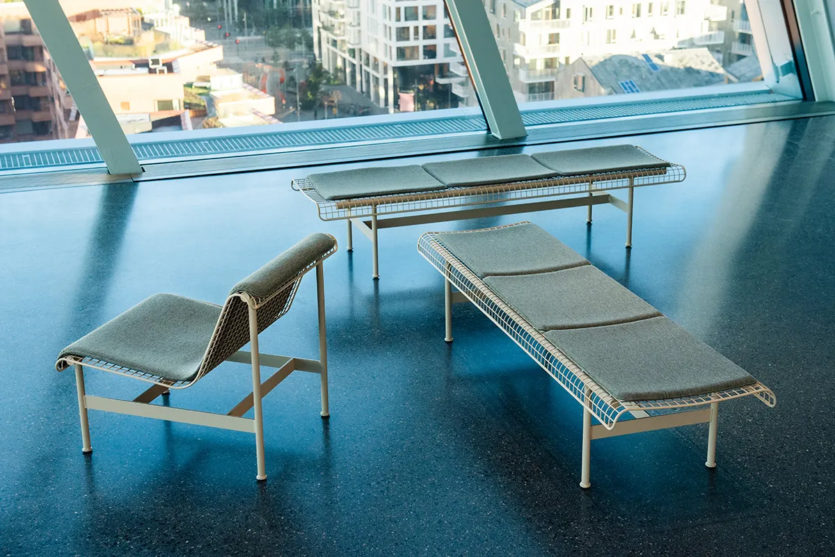 Seats include a layer of springy steel mesh draped over a simple steel frame. Matching injection moulded cushion sets are also available. The Munch series is equally at home indoors and outdoors.