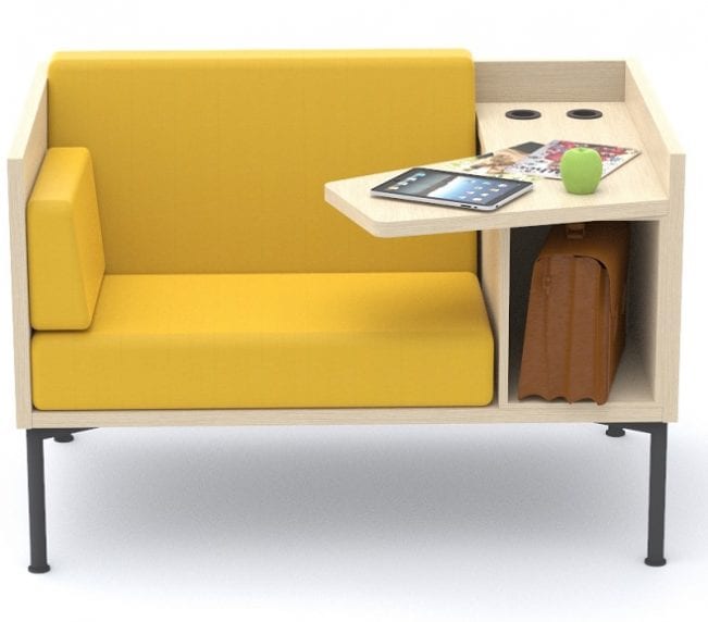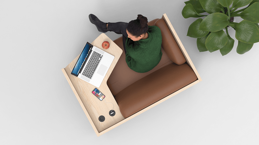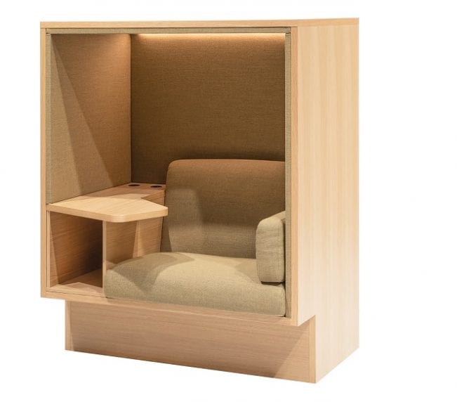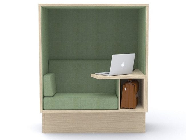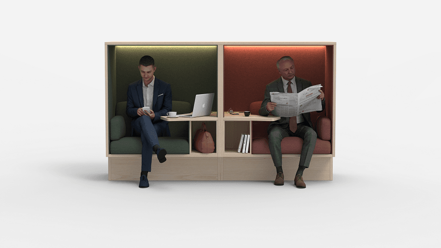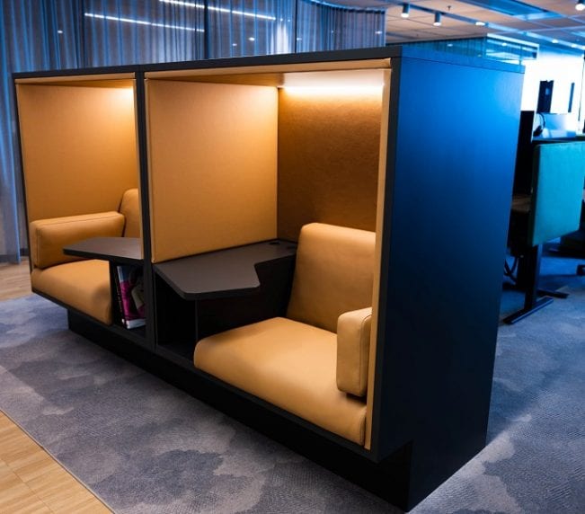 Our lower Mute Focus low is based on the same frame as Mute Focus but is made for open environments, e.g. project meetings or in a lounge environment. Mute Focus Low has all the accessories like Mute Focus, i.e. workspace, possibility to set the bag and electricity for charging.