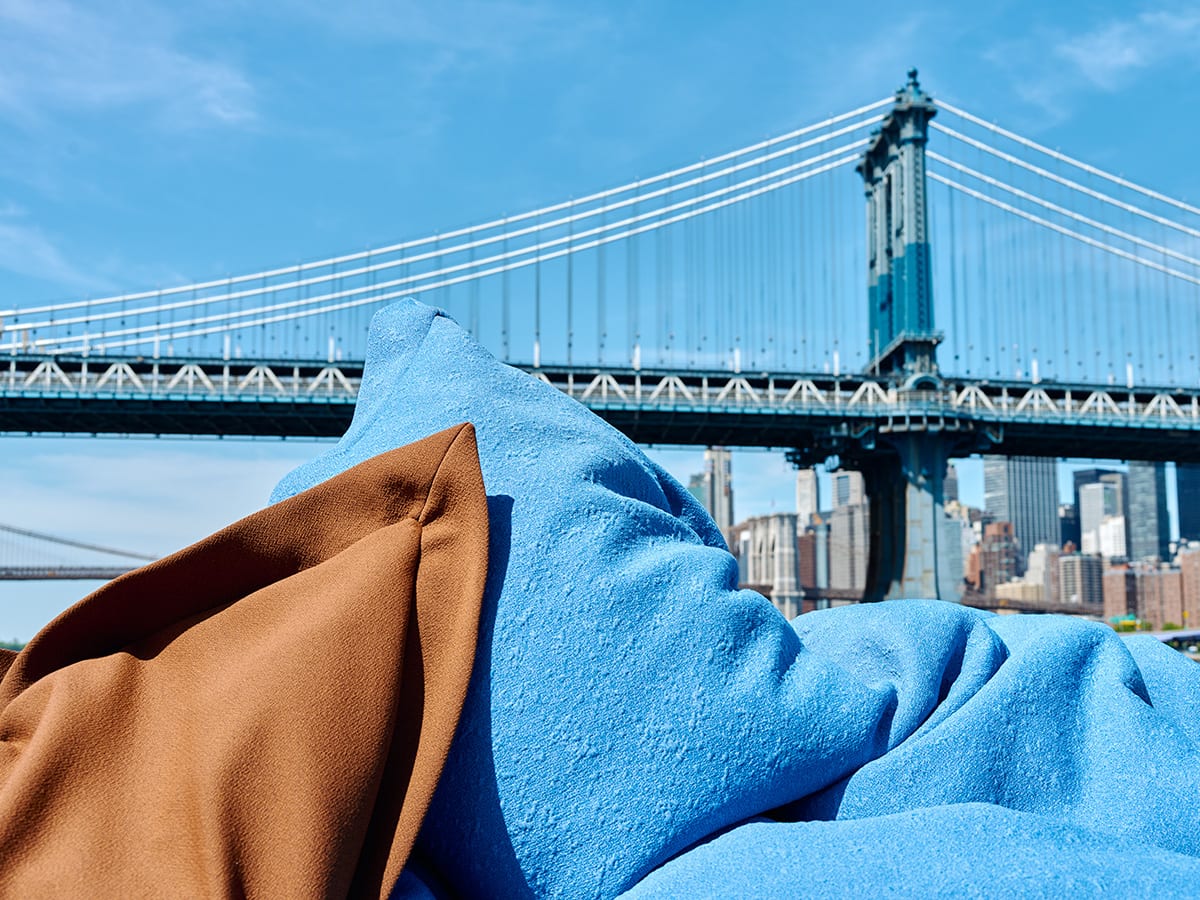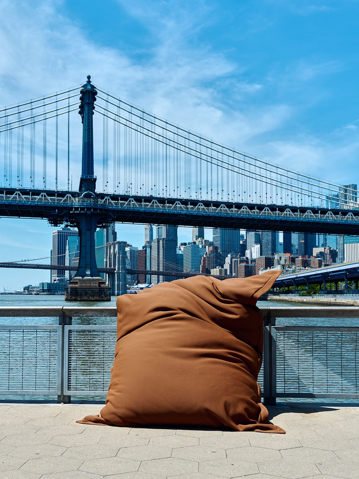 Photographed on the streets of New York, the oversized cushions extend the installation beyond the showroom walls. Set against the city’s architectural landmarks and skyline, their soft, voluminous forms create a striking contrast—offering a fresh perspective on material, scale, and context.