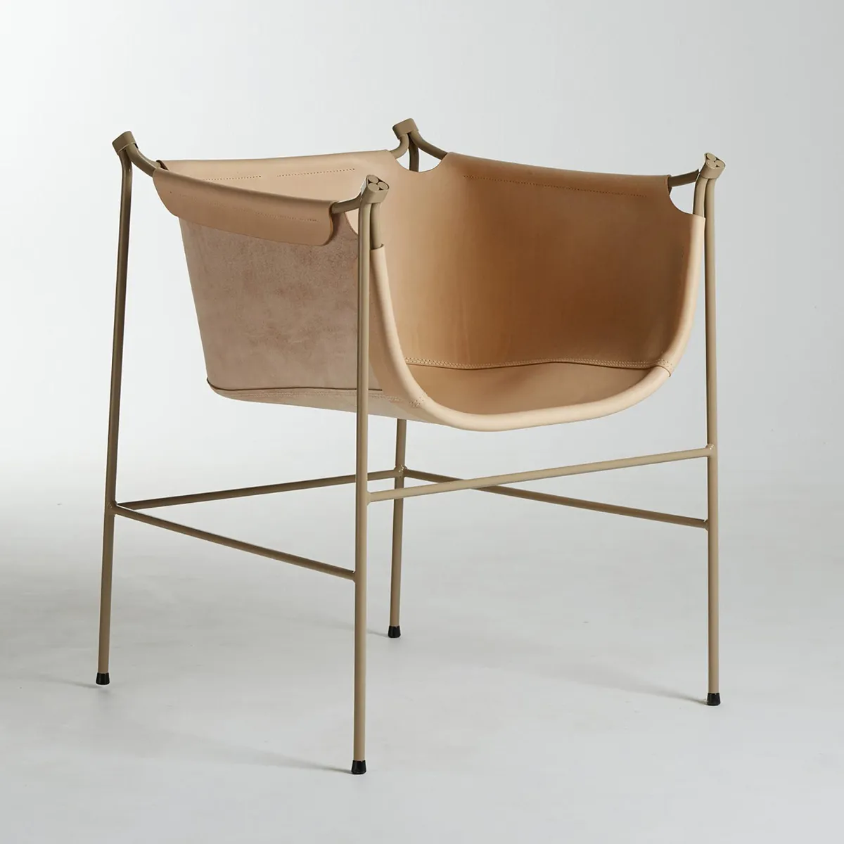 The Näbb chair can be seen as a comfortable armchair, or as a streamlined club chair, depending on how it is used. The seat and backrest are made from a leather sheath suspended from the steel frame, which overlaps at the top and is stitched in place. The simple combination of leather and steel create a striking chair that has an understated character. The leather pieces are sourced from Tärnsjö Garveri and can be complemented by fabric panels attached to the chair’s back and sides.