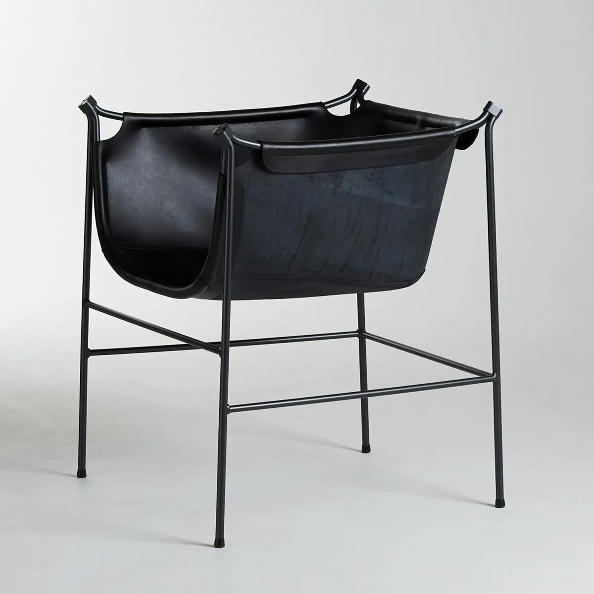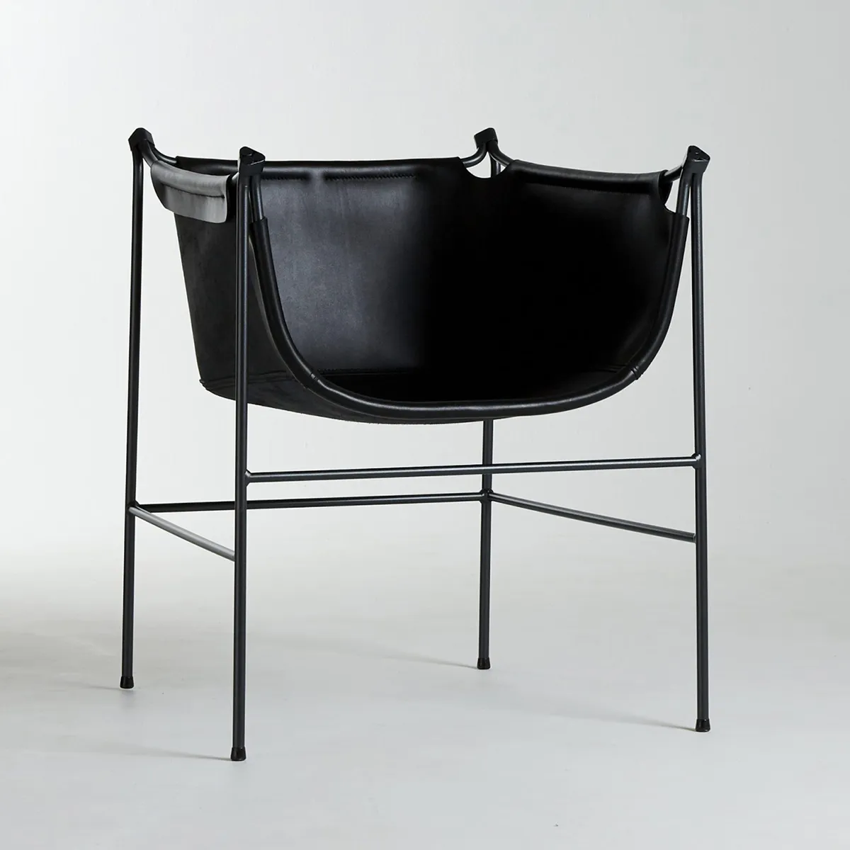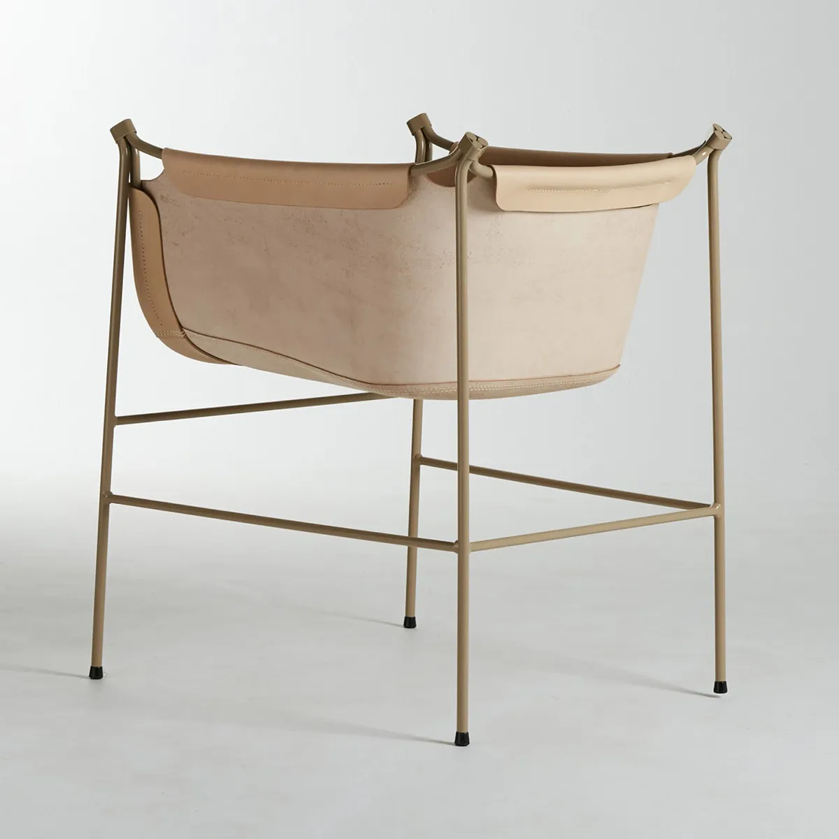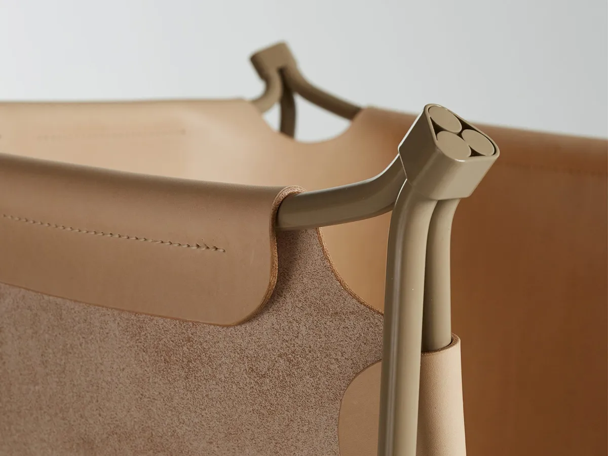 The Näbb chair can be seen as a comfortable armchair, or as a streamlined club chair, depending on how it is used. The seat and backrest are made from a leather sheath suspended from the steel frame, which overlaps at the top and is stitched in place. The simple combination of leather and steel create a striking chair that has an understated character. The leather pieces are sourced from Tärnsjö Garveri and can be complemented by fabric panels attached to the chair’s back and sides.