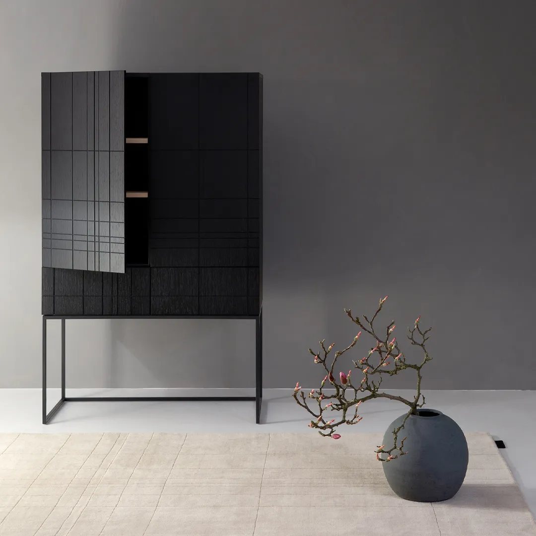Kilt Tall elegantly reaches for height, creating a slender silhouette that catches the eye. With two doors and generous storage space behind the characteristic grid pattern, it offers a perfect balance between practical function and visual elegance. The lower drawer in oak provides a warm contrast to the cabinet’s lacquered surface and testifies to Asplund’s dedication to fine material choices.