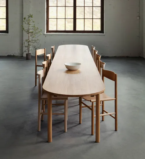 Basic is available in solid ash or oak, either in oval or rectangular shape. One can also combine the shapes by using tables with one oval and one rectangular end: this way it is possible to build a long banquet table, which is then again very easy to separate back into smaller units. By adding rectangular tables in between the oval end versions it is possible to build extremely long entities.