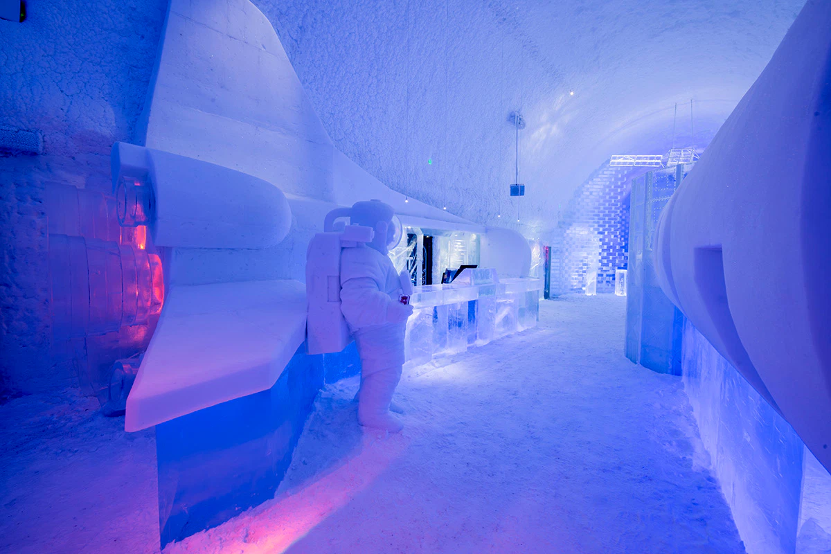 In November the grand opening of the new space-inspired ICEBAR, “In Orbit,” at ICEHOTEL in Jukkasjärvi. Created by Christian Strömqvist and Karl-Johan Ekeroth, PinPin Studio, in collaboration with Christer Fuglesang, Sweden’s first astronaut, ICEBAR In Orbit offers a memorable experience where you can warm up in the crystal-clear cold with a drink while embarking on a unique journey through space. Guests can sip on a drink beside a life-sized ice and snow astronaut, or make a quick exit via a slide carved from ice and snow. ICEBAR “In Orbit” is part of ICEHOTEL 365, the year-round section of Icehotel, which also features 18 art and deluxe suites made of ice and snow, and an experience room with a cinema.